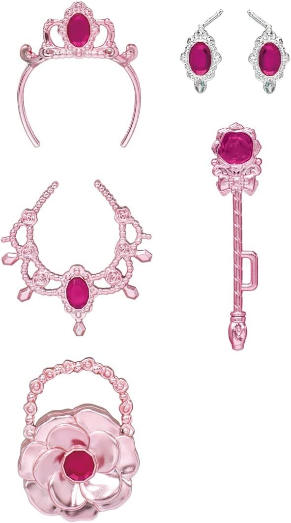 A dazzling, sparkling, magical 2-way dress that changes from a golden dress to a jeweled dress when the skirt is turned around. This sparkling metal-colored princess dress with large rhinestones is eye-catching. The skirt can be turned around to magically change from a gold dress to a dress filled with jewels, allowing you to enjoy the dress in two different ways. The dress comes with accessories with ruby-colored jewels. Set includes: Dress (one-piece, overskirt) (1), tiara (1), necklace (1), bag (1), walking stick (1), earrings (1), shoes (1), *Doll sold separately. (C) TOMY