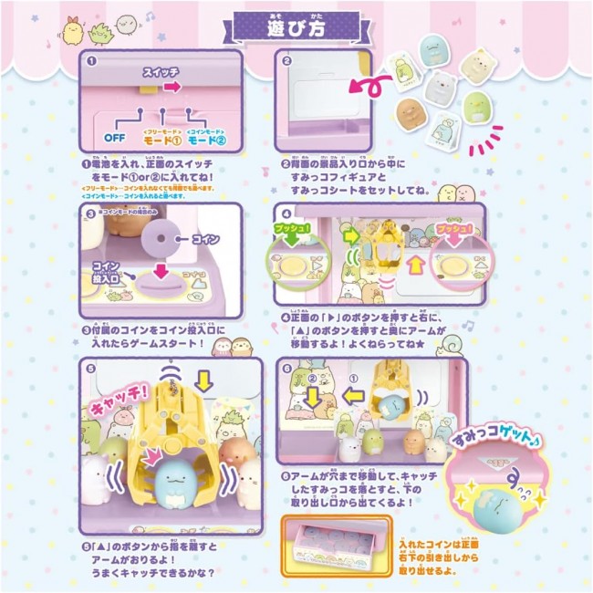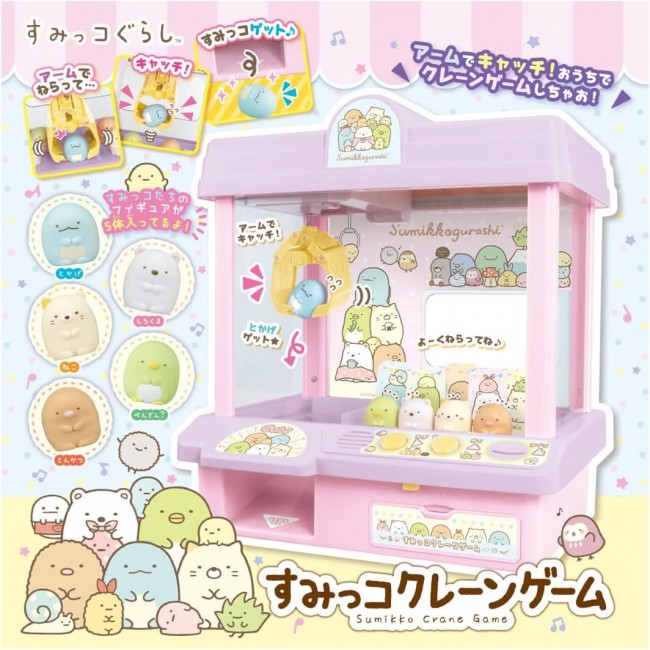 Sumikko Gurashi's crane game is now even cuter in popular colors! Control the arm with the button to get Sumikko! Includes 5 Sumiko figures! You can enjoy playing in two modes: coin mode and free mode. A cute melody plays to liven up your crane game play! Set Contents] Sumiko Crane Game(1),Figure(Cat)(1),Figure(Lizard)(1),Figure(Shirokuma)(1),Figure(Tonkatsu)(1),Figure(Pengin? (1),Paper accessories (background board, Sumikko sheet) (1),Label sheet (1),Coins (10) (C) TOMY (C)2023 San-X Co. Uses 3 AA alkaline batteries (batteries sold separately) Battery case lid is screwed on to prevent accidental ingestion.