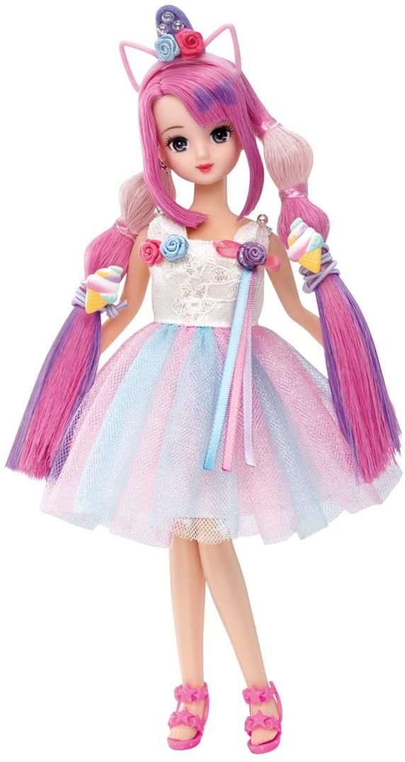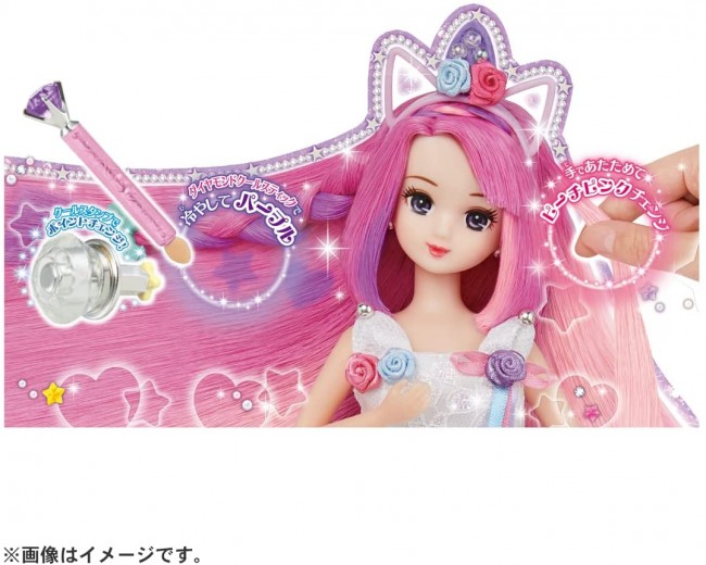 Easy hair color change to three dreamy colors! This is Licca-chan Friend Misaki, who can easily change her hair color to three dreamy colors. Her normal hair color is pink. When warmed by hand, it turns milky pink, and when cooled with the Diamond Cool Stick (using ice water), it turns purple. Fill the cool bottle with ice water, set the cool stamp on the lid side, cool it, and press it against your hair to change the color into a cute pattern. You can also enjoy various hair arrangements with colorful accessories. Hair arrangement book and stand are included. Set includes] Doll (wearing dress, underwear, catsuit, earrings) (1), cool bottle (with lid) (1), cool stamps (3), diamond cool stick (1), unicorn clip (2), ice cream pony (2), star pin (3), moon star barrette (1), Dream Color Heart Brush(1),Kutsu(1),Stand(1),Hair Arrangement Book(1) (c) TOMY