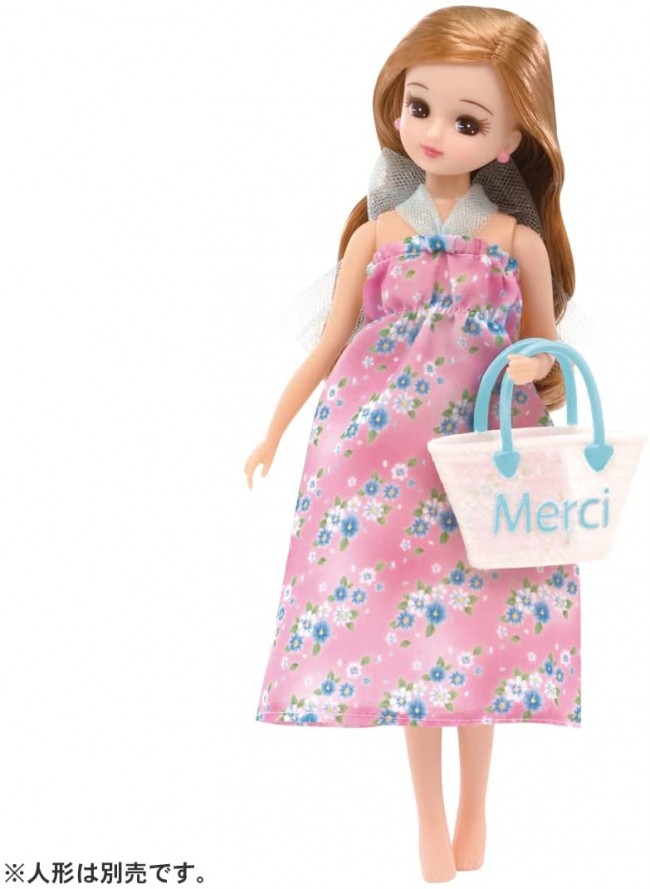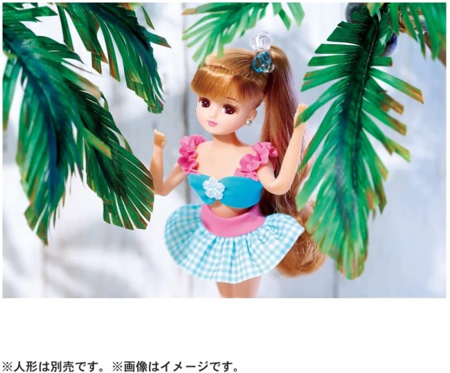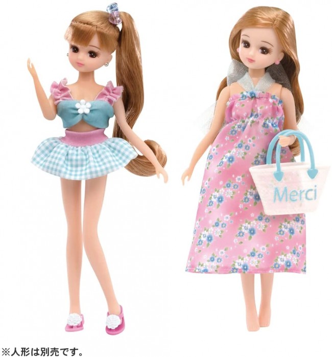 A cute swimsuit set with gingham check and flower motif ♪ A cute swimsuit set with a light blue gingham check swimsuit and a pink floral resort dress. Includes bags, sandals and heart accessories. [Set contents] One piece (1), swimsuit top (1), swimsuit bottom (1), bag (1), shoes (1), hair accessories (1), * Dolls are sold separately. (c) TOMY
