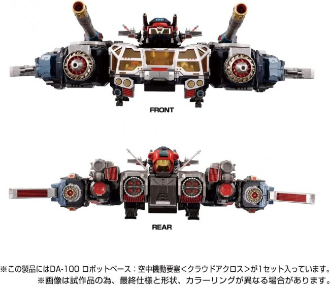 The 7th Robot Base Project, the "Cloud Across," an aerial mobile fortress! Equipped with two gigantic cannons and a huge fan-shaped silhouette reminiscent of an all-wing aircraft, the "Cloud Across" is an invincible aerial mobile fortress that also functions as an airborne mother ship, with retractable hangers on both sides of the fuselage, machine launch and landing ports, and a small shuttle hangar in the stern. The central main bridge, covered by a shiny silver structural frame, accommodates six personnel, and the top of the fuselage is equipped with a separable machine gun turret that doubles as a rotating turret and sub-bridge. Combined with the previously released DA-95 Robot Base: Land Mobile Battleship , the 62cm tall super-dreadnought base type heavy mobile machine is finally completed! Diaclone members of about 3cm in height, interwoven with a variety of giant robot situation play! Onboard machine: 1 small jet-type machine, 1 small helicopter-type machine, 1 small 6-seater shuttle-type machine, 1 1-seater machine with gun turret. Includes 6 diacron crew members. Experience a new dimension of giant robot entertainment toys that transcend the common wisdom of robot toys! Contents】Body(1),Big Weapon (Right)(1),Big Weapon (Left)(1),Head Unit(1),Machine A(1),Machine B(1),Machine C(1),Machine D(1),Weapon(2),Chair A(4),Chair B(2),Diaclone Team Members(6),Lock Parts(1),Steel Sheet ( 1),Pamphlet(1),Instruction manual(1) (C) TOMY
