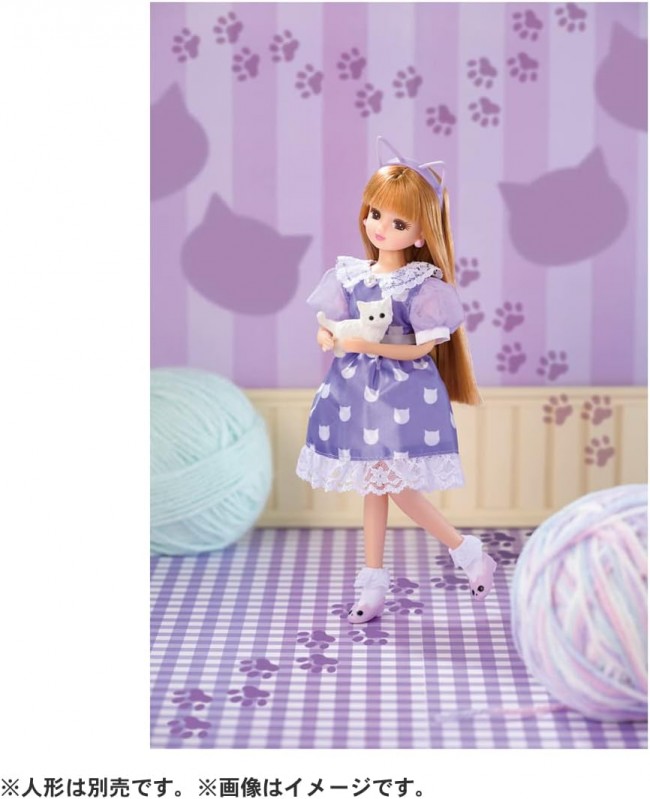 Dress set full of cat motifs! With a cute little cat! The combination of purple background, cat print, and white lace makes for a mature dress. Match it with a cat motif catsuit and pumps, and let the cat cuddle her to complete the cute cat coordinate! Set includes]Dress(1),Socks(1),Catsuit(1),Knots(1),Cat(1),*Doll sold separately. (C) TOMY