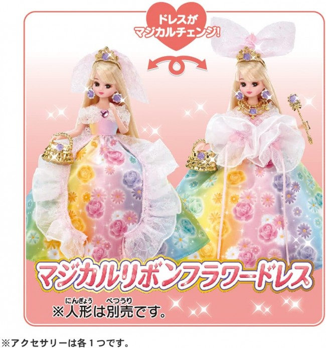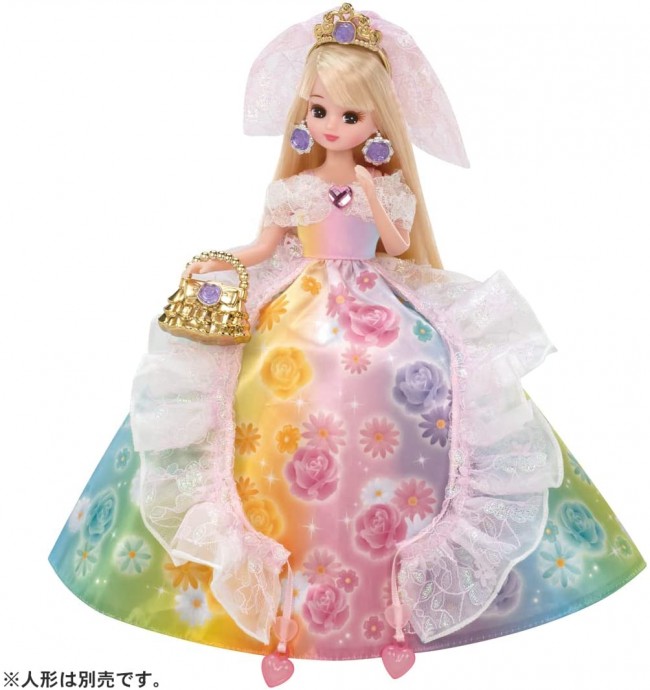 When you pull the heart beads...the ribbon changes into a flower and the veil changes into a bow in this magical dress with iridescent floral pattern. Comes with gold plated accessories. This is a rainbow-colored, flower-patterned princess dress with a single jewel on the chest. By pulling the beads, the ribbon can be rolled or ruffled. The skirt ribbon transforms into a flower and the veil into a large bow. Comes with accessories with gold plated and purple jewels. Set includes] Dress (1), earrings (1), tiara (1), necklace (1), bag (1), walking stick (1), shoes (1), *Doll sold separately. (c) TOMY