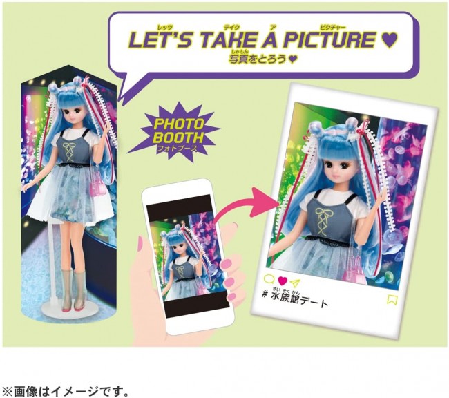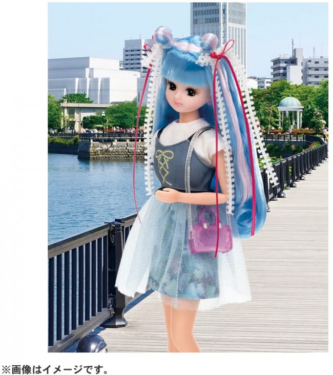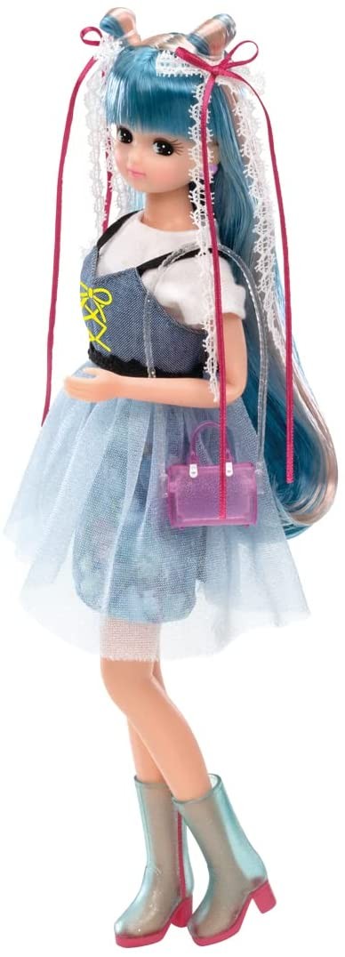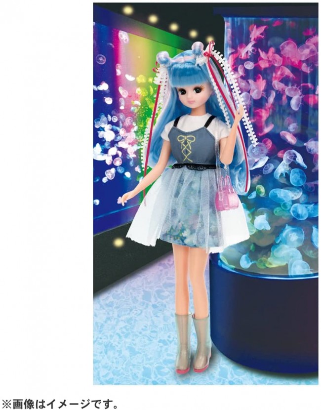 Here is #Licca (hashtag Rica) in a refreshing ocean-inspired coordinate. With long sea-colored hair, #Licca (hashtag Rica) wears a white shirt and a jellyfish-patterned miniskirt with a transparent, refreshing bustier. Comes with transparent material boots, mini shoulder bag, and long hair accessory with two layered colored ribbons. Includes background sheet and stand. *The dress and shoes can be used for both #Licca and regular Rica-chan, but the image when dressed up will be different because of their different heights. (Some of Licca's shoes and pants, such as long boots, may not be able to be worn with #Licca.) Set includes] Doll (wearing dress, earrings, ring and underwear) (1), hair accessories (2), mini shoulder bag (1), boots (1), stand (1), background sheet (1) (c) TOMY