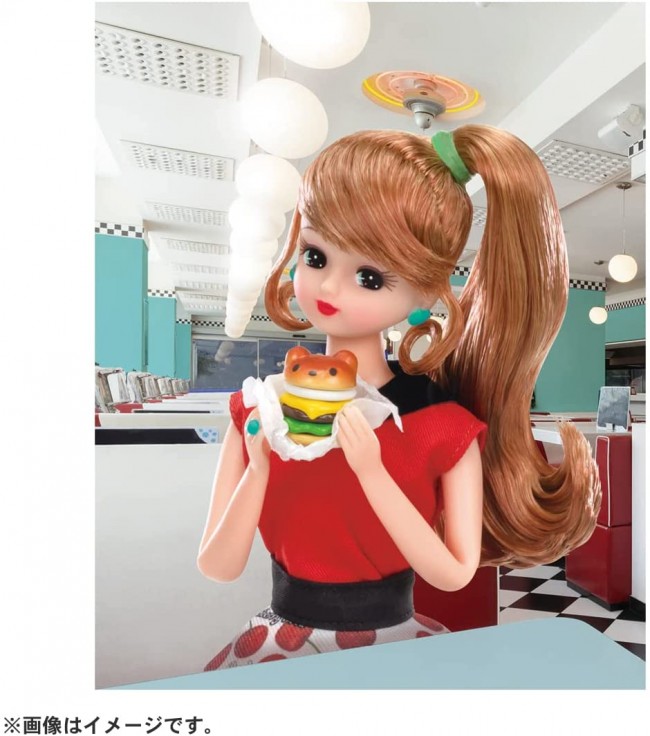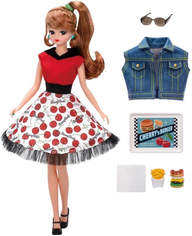 This is #Licca (hashtag Rica) for a stylish burger store staff uniform. This fashion is inspired by rockabilly style. The red top, cherry-patterned skirt, and denim-style vest coordinate with the rockabilly style. Comes with bear-shaped hamburger, lapping paper for hamburger, fries, tray, sunglasses, and strap shoes. Includes background sheet and stand. Dress and shoes for #Licca and regular Licca can be used together, but the image when dressed up will be different because of their different heights. (Some of Licca's shoes and pants, such as long boots, may not be able to be worn with #Licca.) Set includes] Doll (wearing dress, earrings, rings and underwear) (1), vest (1), sunglasses (1), shoes (1), tray (1), hamburger (1), hamburger wrapping paper (1), fries (1), potato case (1), background sheet (1), stand (1) (c) TOMY