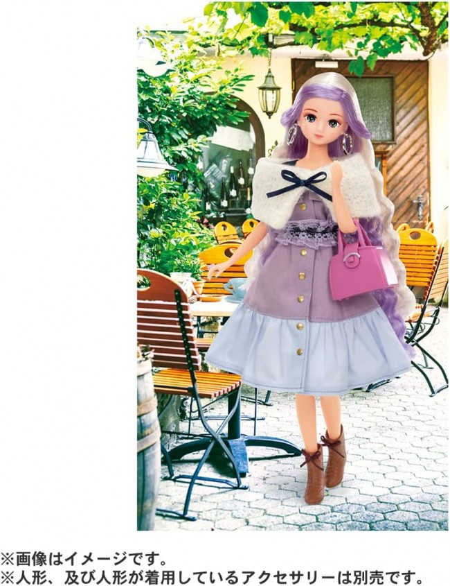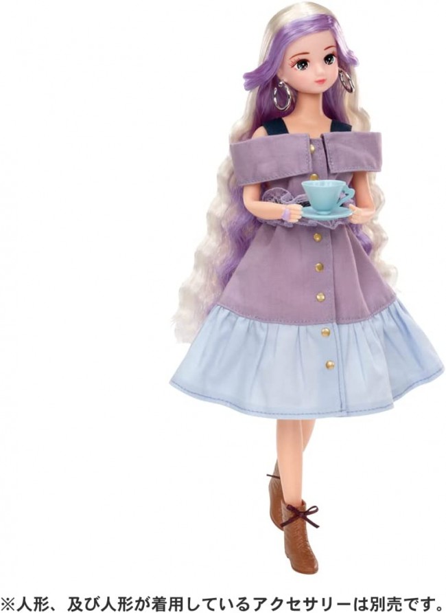 Clothing for dolls. Off-the-shoulder shirt dress in the popular purple tone with coordinating white cape. Set includes short boots, bag, teapot, teacup, teasaucer, and two types of tooncalons. Dolls are sold separately. Contents Dress (1), Belt (1), Cape (1), Tuncalon (Heart) (1), Tuncalon (Round) (1), Tea Saucer (2), Tea Cup (1), Teapot (with lid) (1), Bag (1), Boots (1), *Doll sold separately. (C) TOMY (From TOMY website)