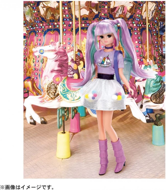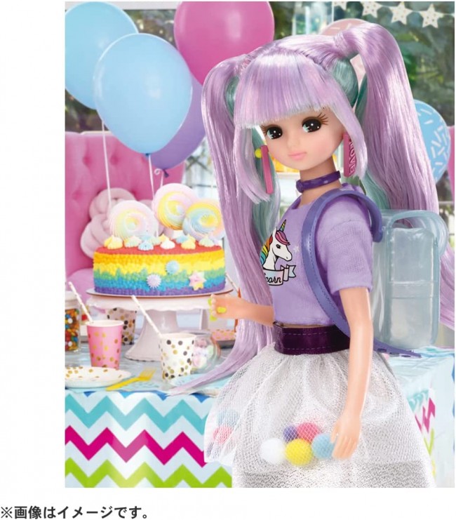This is #Licca (hashtag Rica) wearing unicorn motifs & colors in a mature look. Twin-tail hair in a two-color mix of unicorn colors, a unicorn print T-shirt, and a skirt with colorful bonbons swaying in the air are all coordinated with this look. A clear backpack with matching print on the T-shirt, fringe boots, choker, and earrings with charms are included. Set includes] Doll (wearing dress, rings and shorts) (1), earrings (1), choker (1), backpack (1), boots (1), stand (1), background sheet (1) (c) TOMY