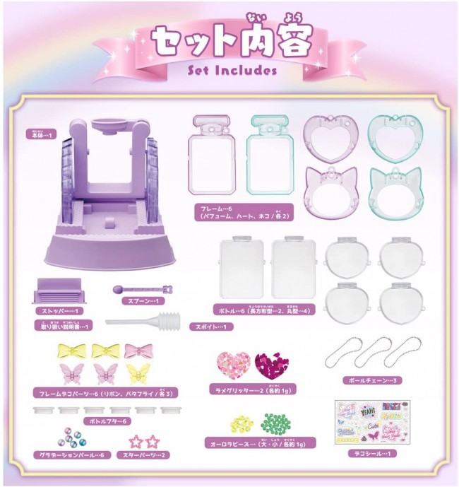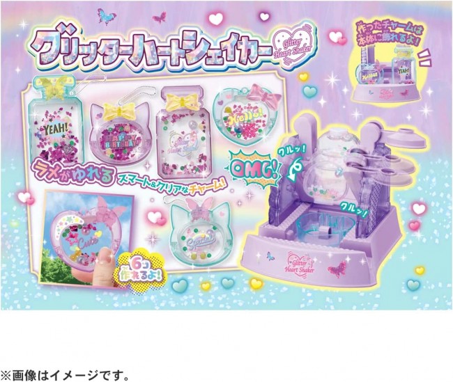 Smart and clear charms with shimmering lame! Easy to make heart shaker style charms with shimmering lame in the water! Set the bottle in the body and fill it with your favorite lame glitter, beads, star parts, and water! Put the lid on the bottle, place the frame on the body, and move the handle to make the bottle spin around! Once the bottle is in the frame, decorate it with the included deco parts and stickers. Place the finished charms on the main body to display them in style, or attach a ball chain to carry them around with you! You can make a total of 6 Glitter Heart Shakers! You can make more heart shakers by using the "Glitter Heart Shaker Special Sold Separately Set" sold separately. Contents】Body(1),Frame(Perfume, Heart, Cat / 2 each)(6),Frame Deco Parts (Ribbon, Butterfly / 3 each)(6),Bottle (Rectangle 2pcs, Round 4pcs)(6),Bottle Lid(6),Spoon(1),Stopper(1),Syringe ( 1),Star parts (2),Gradation pearl (6),Aurora beads (large/small/about 1g each) (2),Lame glitter (2 kinds/about 1g each) (2),Ball chain (3),Deco sticker (1),Instruction manual (1) (c) TOMY