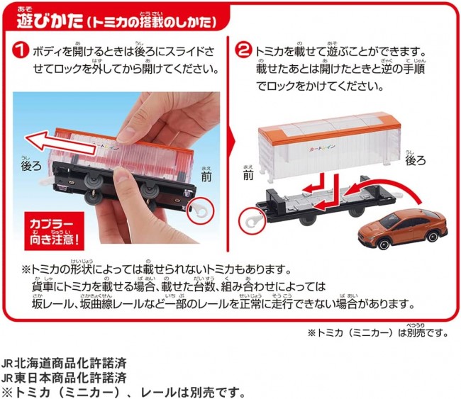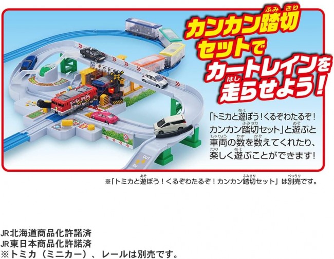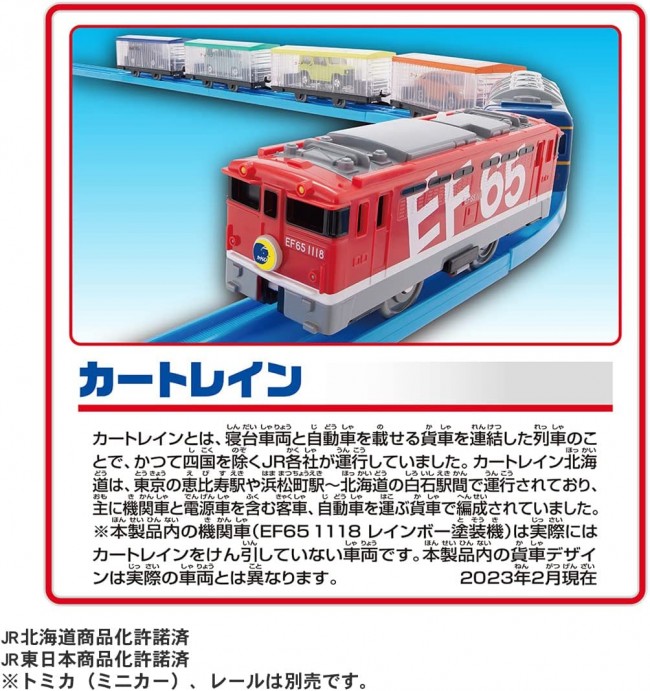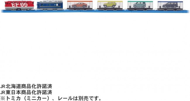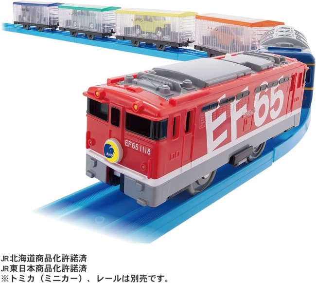 Model trains (electric, rail type, etc.) Modeled after the "EF65 1118 Rainbow Painted Aircraft Each of the 6 cars can be connected and disconnected. Electric running at 1 speed. Electric running at one speed and hand-rolling with the switch OFF. Each freight car can be loaded with Tomica cars (sold separately) One Tomica can be mounted on each freight car, allowing up to 4 cars to play together. Each freight car can carry one Tomica, which is sold separately. Tomica (miniature cars) and rails are not included. The train configuration of this product is fictitious. The design of the lead car and freight cars are different from the actual cars. Depending on the shape of the Tomica, some Tomicas may not be able to be loaded. Product Contents 6-car train (1), parts order form (1) (C) TOMY JR Hokkaido Merchandising Permission Approved Licensed for commercialization by East Japan Railway Company (From TOMY website)