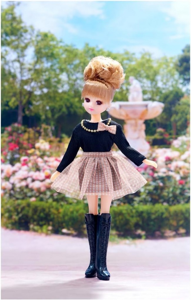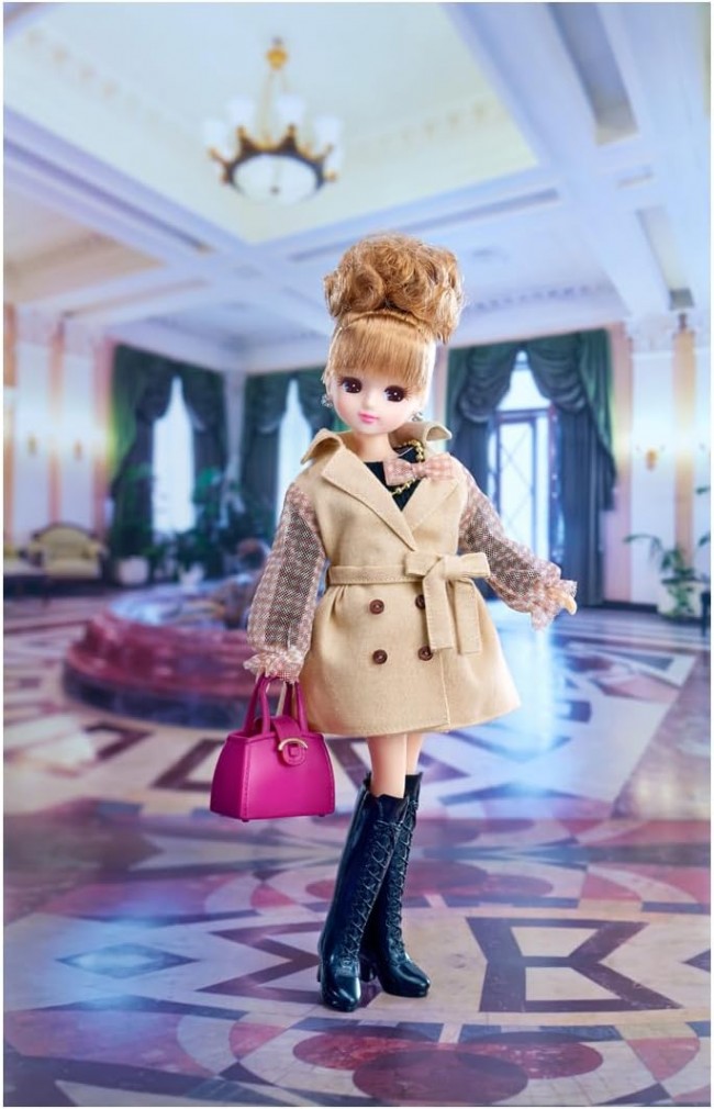 Licca-chan in real close fashion that both parents and children can enjoy. Her outfit is a mix of different materials, featuring a trench coat with tulle sleeves. Pair the black knit long-sleeved top with a knit and tulle layered skirt. The stylish advanced style is complete with an up bun and silver earrings. Wine red handbag with black booties. [Set contents] Doll (tops, skirt, coat, earrings, underwear) (1), handbag (1), long boots (1) (C)TOMY