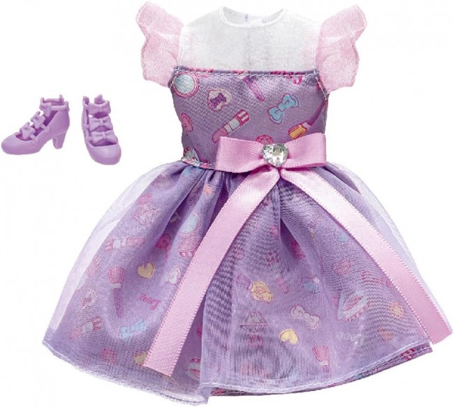 Purple x pink cosmetic motif dress♪ Now available at a value price! Pink ribbon with heart-shaped rhinestones! A cute purple dress with a cosmetic print. Comes with purple shoes. [Set contents] Dress (1), shoes (1), *Doll sold separately. (C)TOMY