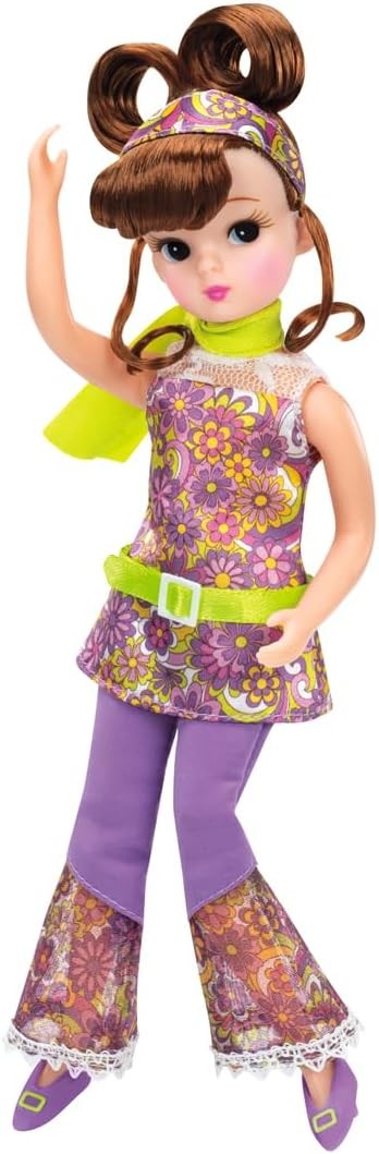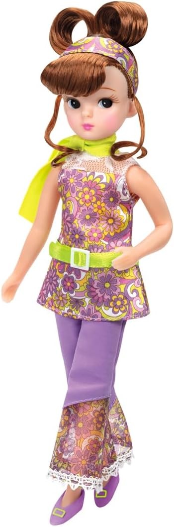 This retro Rika-chan inherits the face and body design of the original “Rika-chan” created in 1967, but has evolved to be easier to pose. The see-through material changes to a modern pantaloons look, and the psychedelic print design is a retro cute style. Her hair is pulled up in a bun, and a thick hair band adds to the atmosphere. She comes with a pair of shoes with buckles and a bag with a matching pattern to the dress. The doll is not compatible with the regular Rika-chan series. Set includes: Doll (Retoro-Rika) (wearing top, bottoms and underwear) (1), bag (1), shoes (1), hair band (1), scarf (1), belt (1) (C) TOMY