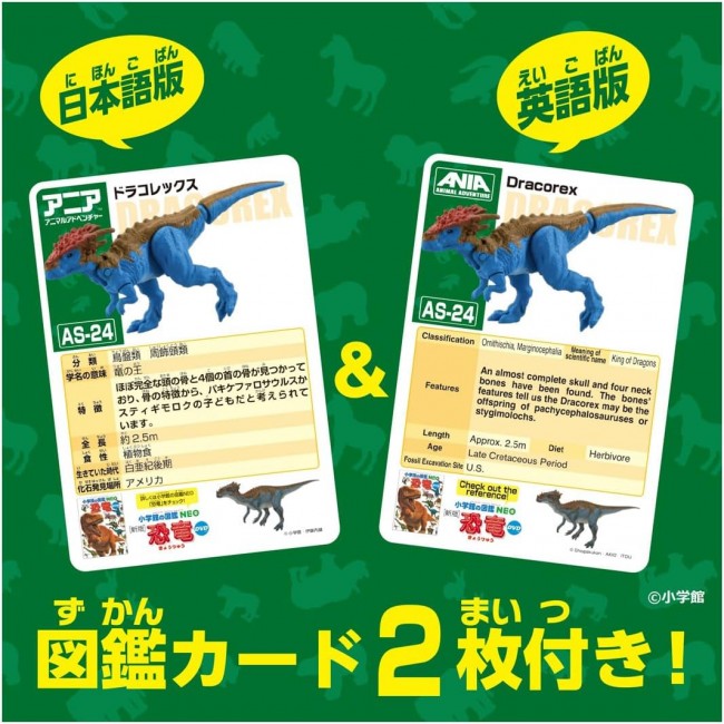 Dracolex” is now available in the Ania AS Series! Dracorex has a movable head, legs, and tail. Ania” is a series of palm-sized animal figures that can be moved and played with. The “Ania” series is a series of palm-sized animal figures that can be moved around and played with. The appeal of this series lies in its movable action, realistic modeling and painting, and palm-size for easy play. Set Contents】figure(1),picture book card (Japanese)(1),picture book card (English)(1) (C) TOMY