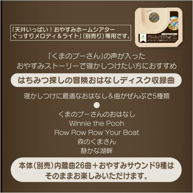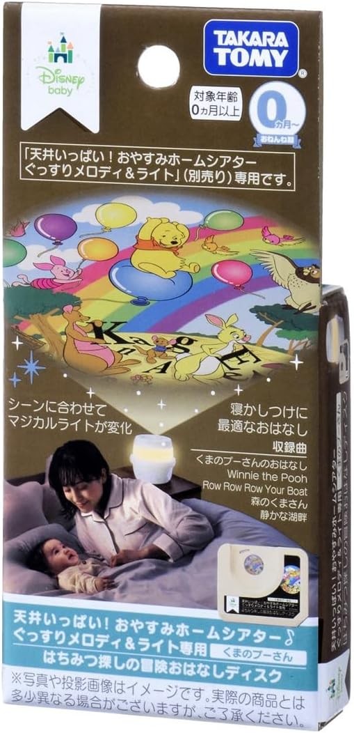 Separately sold disc exclusively for "Ceiling Full! Separate disc sold exclusively for "Good Night Home Theater Gusuri Melody & Light"! You can enjoy "Winnie the Pooh" stories and English songs. Gentle light and soothing melodies help put babies from 0 months and up to sleep. The ceiling is filled with the dream world of Disney. Good Night Home Theater Gusuri Melody & Light". Dedicated disc (sold separately). It contains an original story with the voice of "Winnie the Pooh" and is recommended for those who want to read aloud to their children at bedtime. The world of picture books fills the ceiling. Suitable for ages from around 0 months and up. Includes 1 story and 4 songs from "Winnie the Pooh," a short bedtime story with the voice of Winnie the Pooh. Included in the package are (1)Winnie the Pooh (2)Row Row Row Your Boat (3)Winnie the Pooh in the Woods (4)Quiet by the Lake (4)Quiet Lakeside (26 built-in songs and 9 types of good-night sounds can be enjoyed without any modification. Contents] Disk (1) (Based on the "Winnie the Pooh" works by A.A.Milne and E.H.Shepard.