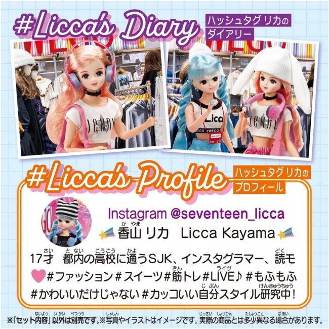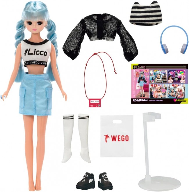 This #Licca (hashtag Rica) doll set is designed and produced by WEGO, a popular teen apparel store. She wears her hair in a twisted two-tail hair style in a fresh blue color. Coordinates with mini-length logo tank top, mesh outerwear and blue cargo skirt! She is wearing a cat ear knit, socks, and thick-soled sneakers in a trendy outfit. Comes with WEGO logo shopper, pre-sticker, and stand. Dresses and shoes of #Licca and regular Licca can be used together, but the image when dressed up will be different because of their different heights. (Some of Licca's shoes and pants, such as her long boots, may not be able to be worn with #Licca.) Set includes] Doll (#Licca) (wearing top, skirt, outerwear, earrings, bracelet, shorts) (1), stand (1), pre-sticker (1), hat (1), shopper (1), socks (1), shoes (1), headphones (1), staff ID (1) (C) TOMY (C) WEGO