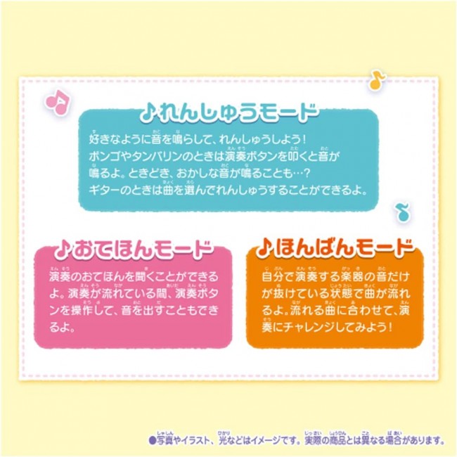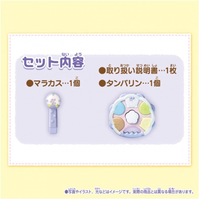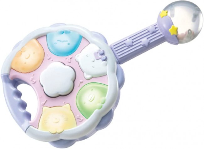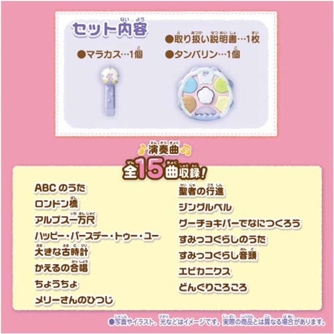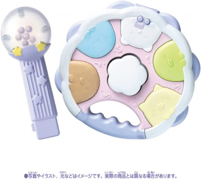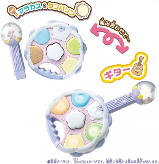Easy to play 4 kinds of musical instruments♪ Sumikko Gurashi characters are glowing in white. Four types of instruments can be played: maracas, tambourine, bongo, and guitar. When maracas and tambourine are combined, they transform into a guitar! The sound also changes according to the form of the instrument. A total of 15 performance songs are included! Training mode" lets you play any sound you like. In "Tehon Mode," you can listen to a sample of your own performance. There is also a "Honban Mode" in which only the sound of the instrument you are playing is left out. Contents】Tambourine(1),Maracas(1),Instruction manual(1) (c) TOMY (c)2022 San-X Co. Uses 3 AA alkaline batteries (batteries sold separately)