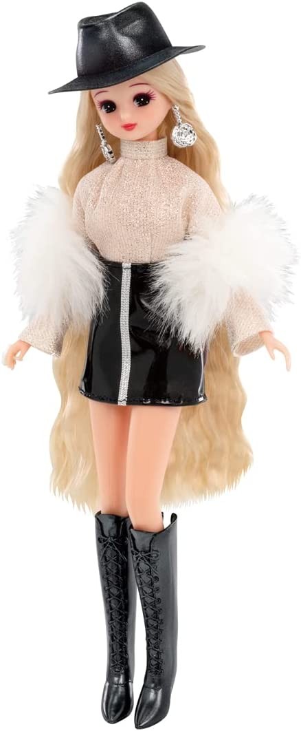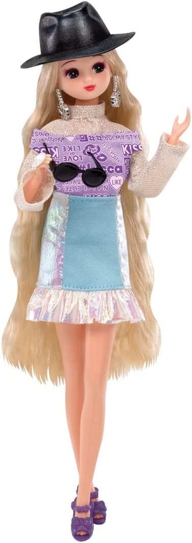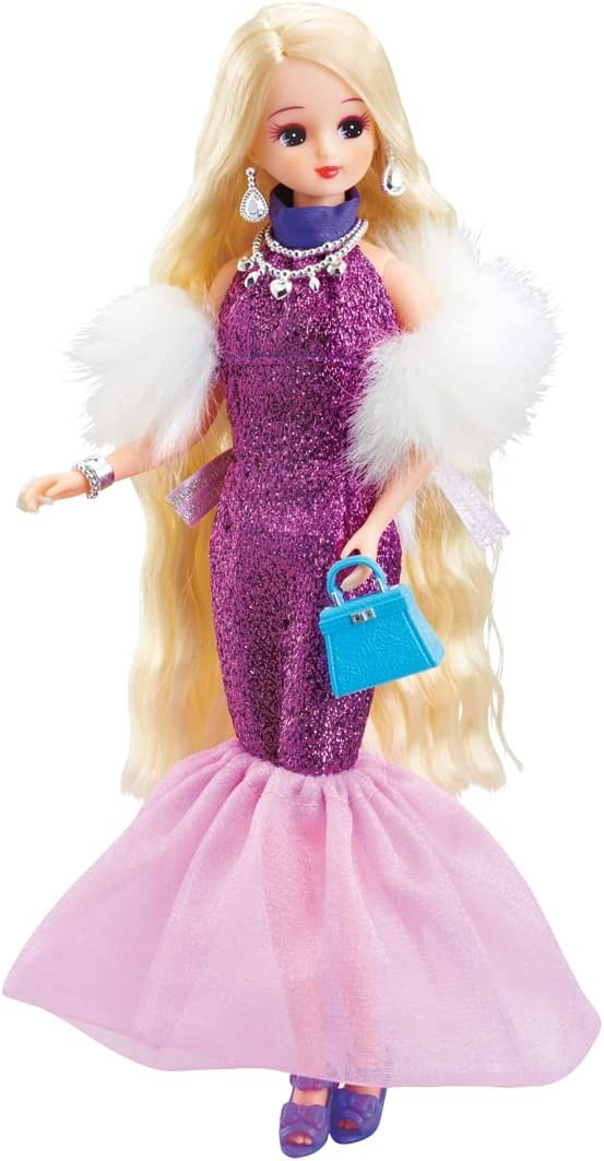A gift set that can be coordinated in over 40 different ways! This set includes a #Licca ( hashtag Rica ) doll, dress, and accessories in a gorgeous fashion inspired by a reception party. In addition to a halter-neck dress made of sparkling material, a boa shawl, and an overskirt that can be arranged in a variety of ways, the set also includes two types of tops and two types of skirts for clothing, two types of earrings, a bangle, a bracelet, a tiara, a catsuit that can also be used with a belt, two types of necklaces, a comb, a pair of sunglasses, and accessories including a hat, a bag, and a pair of sunglasses. A hat, two bags, and two pairs of shoes are also included, allowing for a variety of coordination options. A background sheet and stand are also included. Set includes: Doll (wearing dress, overskirt, jewel earrings, ring, shorts) (1), stand (1), background sheet (1), cut and sewn (1), blouse (1), shawl (1), catsuit (also used as belt) (1), aurora skirt (1), enamel skirt (1) (c) TOMY, hat (1), tiara (1), rose earrings (1), jewel necklace (1), flower necklace (1), bangle (1), bead-like bracelet (1), comb (1), handbag (1), clutch bag (1), sunglasses (1), boots (1), sandals (1) (c) TOMY