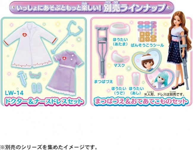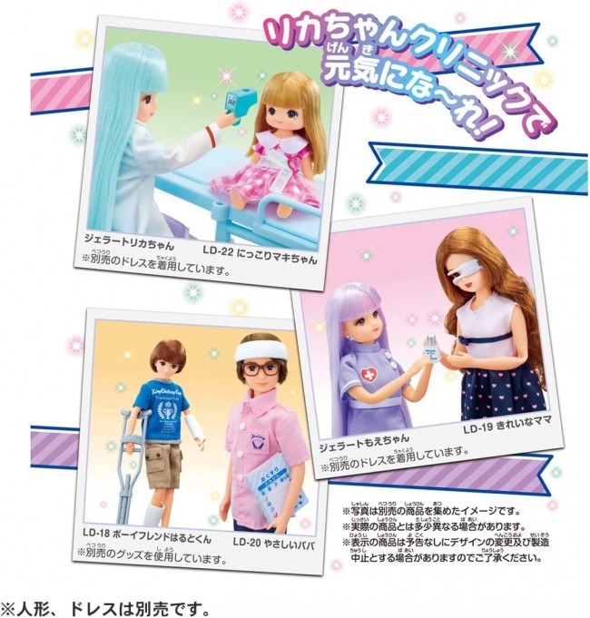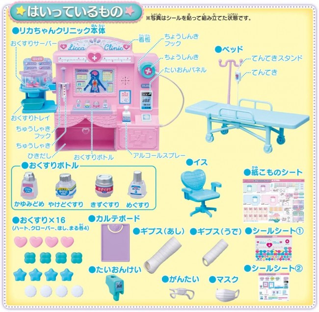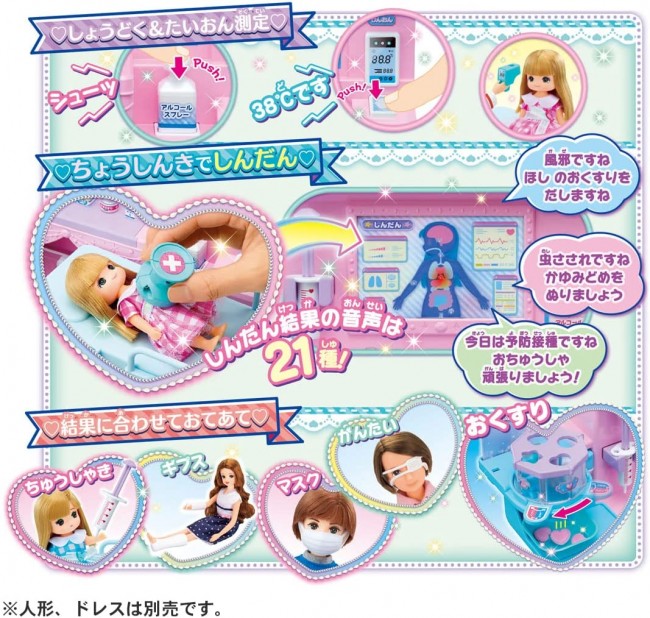 Diagnose with the stethoscope and treat with accessories! Rika-chan's hospital full of sounds to enjoy playing doctor! (1) Measure body temperature and disinfect with alcohol spray (2) Put the patient on the bed and use the stethoscope to diagnose (3) Use small objects to make the patient's hand according to the results of the diagnosis! This set allows you to enjoy a series of realistic doctor's play. When the stethoscope is placed on the patient, the LEDs on the diagnostic screen and Rika-chan's voice will tell you the results of the diagnosis. The set also includes a medicine server, syringe, plaster cast, mask, eye patch, intravenous drip, and many other accessories for your child's hands! Contents】clinic(1),signboard(1),drug server (body, lid, stand)(1),chushiki hook(1),chushiki hook(2),alcohol spray(1),tone panel(1),drawer(1),bed (body, legs x 2)(1),chair (seat, legs, backrest (seat, legs, backrest, clasp) (1), medicine 4 each (16), medicine bottles 4 each (4), medicine tray (1), chashki (1), tent stand (1), tent (1), sound system (1), medical record board (1), mask (1), cancer body (1), cast (leg, arm) (2), paper mask (1), paper mask (1) sheet(1),sticker sheet(1),sticker sheet②(1),*Dolls sold separately. Uses 3 AA alkaline batteries (batteries sold separately) (C) TOMY