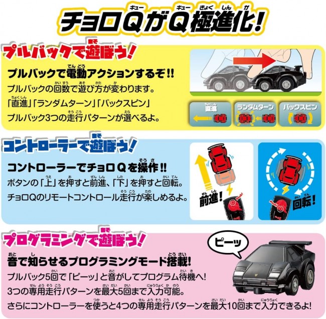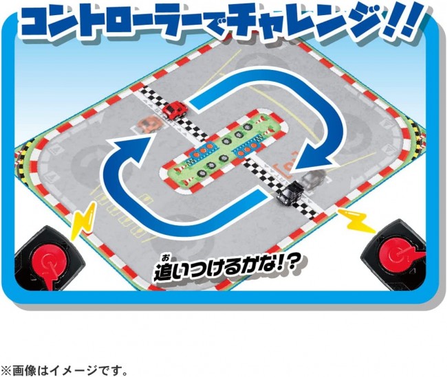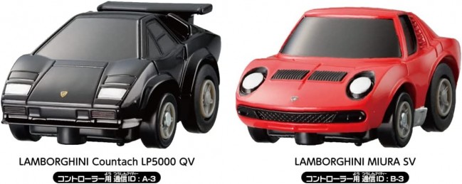 Enjoy games and racing with two Q-pole evolved Choro-Qs! Competitive set includes 2 Choro-Qs, controller, pylon, and play map! Pull back to race! Challenge with the controller! Choro-Q Lamborghini Countach LP5000QV [Communication ID for controller: A-3 ChoroQ Lamborghini Miura SV [Communication ID for controller: B-3 Choro-Q: Lamborghini Countach LP5000QV (1), Choro-Q: Lamborghini Miura SV (1), Controller (2), Pylons (8), Play Map (1), Instruction Manual (1) (c) TOMY Choro-Q (2 units): with test batteries (4 LR44 button batteries) Controller (2 units): with test batteries (4 LR44 button batteries) *When discarding the button batteries, wrap tape, etc. around the batteries to insulate them.