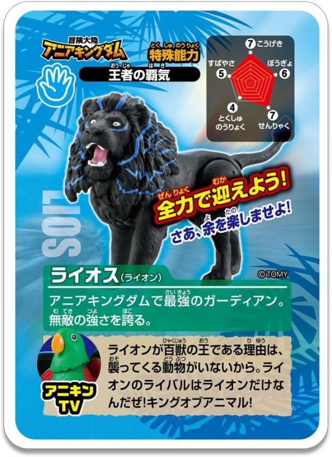From "Adventure Continent: Ania Kingdom - The Legendary Guardians" comes an AL size figure of "Laios (Lion)"! Lion has seven parts of his body that move, including his mouth, neck, both legs, and tail. The figure is larger in size than the AS size lion, with a total length of approximately 9cm. Character Introduction: Ania Kingdom, the Guardian of the West. A large lion with a black body. He lives on a small island surrounded by the sea. His attack, defense, and speed are all the best in the world. It is said that no one has ever been able to defeat the Lion, which boasts unparalleled strength. Set Contents] Figure (1), Character Card (Japanese) (1), Character Card (English) (1) (C) TOMY