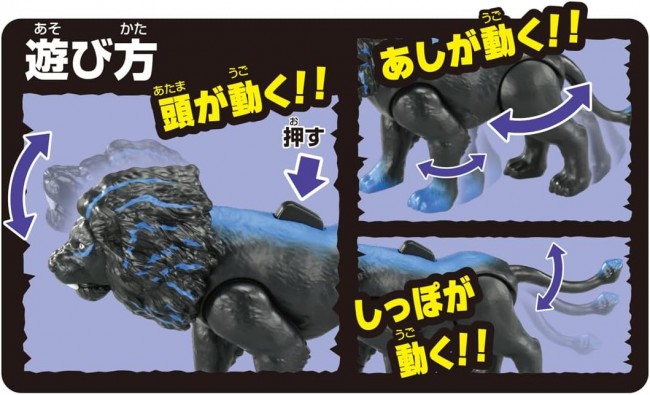 Guardian "Laios (Lion)" from "Adventure Continent Ania Kingdom: Legendary Guardian" is now available as a big-sized ania (approx. 23cm in length)! Press the switch and his head moves! Enjoy the "Bawl Action"! Lion opens his mouth, and his front legs, back legs, and tail move. In addition, by pressing the switch on his back, you can enjoy the "roar action" by shaking his head. Character Introduction: Ania Kingdom's Guardian of the West. A large lion with a black body. He lives on a small island surrounded by the sea. His attack, defense, and speed are all the best in the world. It is said that no one has ever been able to defeat the Lion, which boasts unparalleled strength. Contents] Main body (1) (C) TOMY