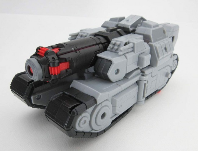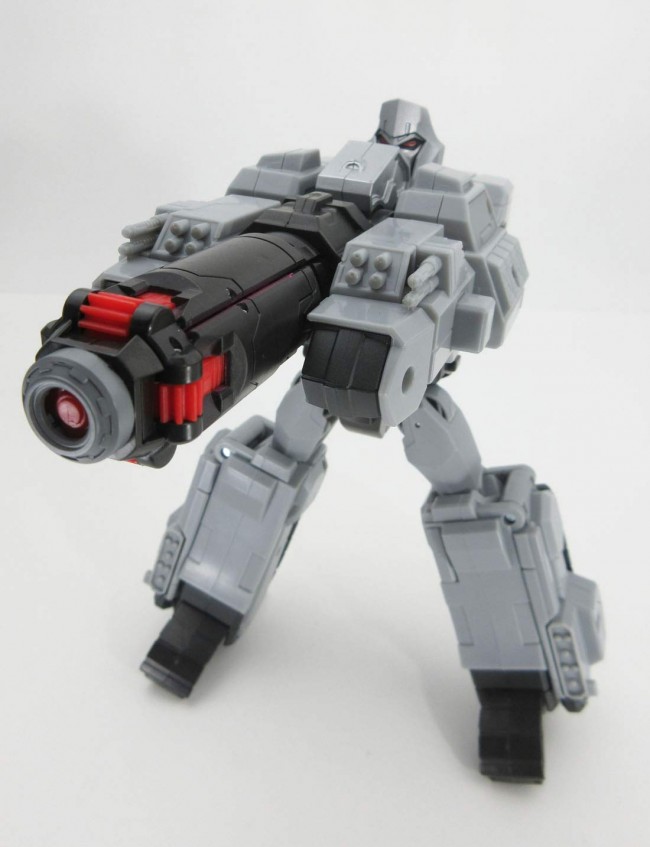 We reproduce the attack action gimmick of Megatron's deadly weapon, Fusion Cannon in both vehicle and robot modes.