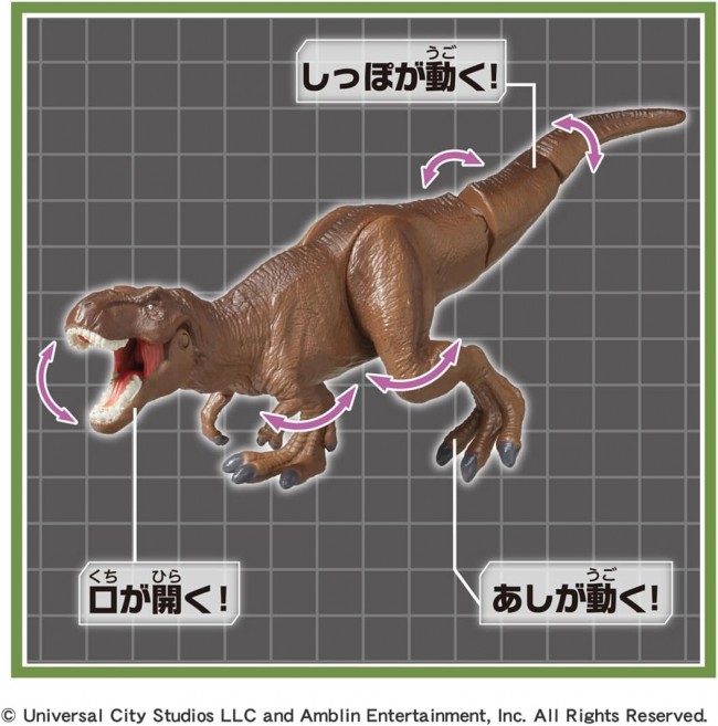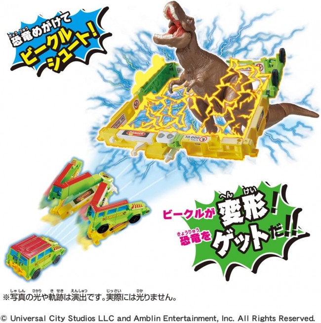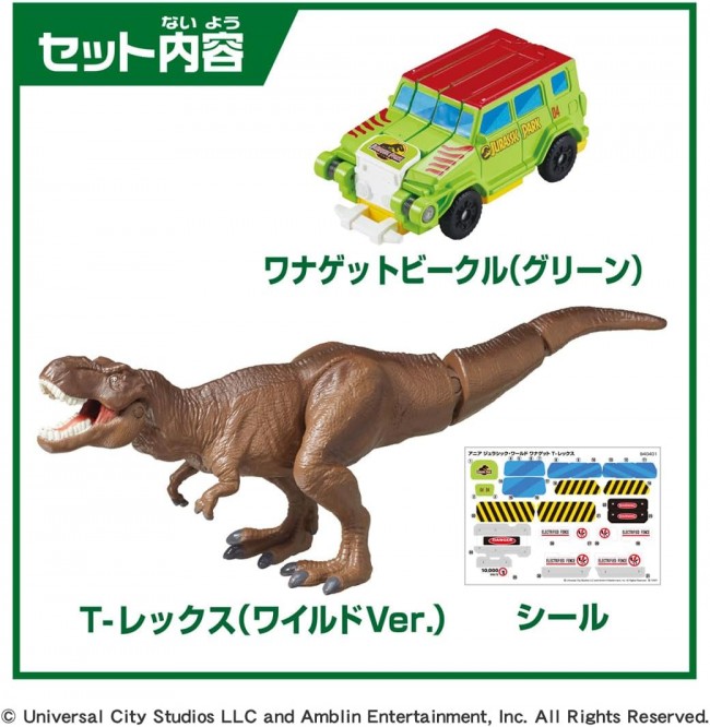 Shoot the Vehicle at the dinosaurs! The vehicle transforms and you get the dinosaur! Drive the vehicle (car) toward the dinosaur ania, and it will transform into a frame shape when it hits the dinosaur. When the vehicle hits the dinosaur, it transforms into a frame. Includes Wanaget Vehicle (green) and T-Rex (Wild Ver.) ania. The T-Rex (Wild Ver.) has a movable mouth, legs and tail. Wanaget Vehicle (Green) (1), T-Rex (Wild Ver.) (1), stickers (1) (C) Universal City Studios LLC and Amblin Entertainment, Inc. All Rights Reserved.