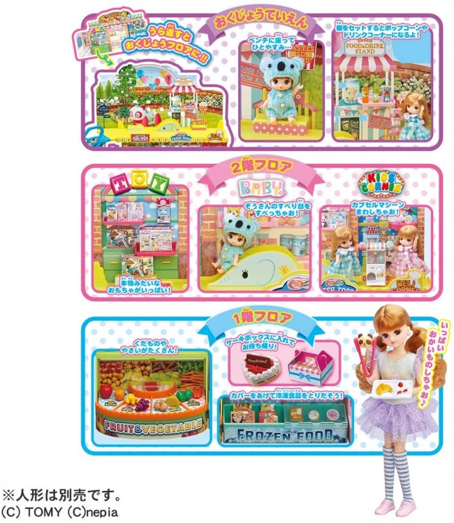 [Set contents] Main body (2 shelves on the 1st floor, frozen hood box, 2nd floor) (4), hooking shelves (9), hooks (2), escalator (with shelves and doll stand) (1), Rica pay cash register (pole) (Including) (1), Bakery 2-tier shelf, Bakery cover, Hook rack, Tong rack (1), Capsule machine (1), Capsule (5), Capsule contents (wrist watch, bracelet, yellowing, hair clip 2 colors) (5) ), Food accessory, baby accessory (27), runner accessory (2), plastic bottle (3), strawberry tray (1), tongs (1), basket (2), shopping bag (2), background Boards (1st floor, 2nd floor, bakery) (3), Senjokomono sheet B4 size (2), Senjou seal B4 size (2), Frozen cover (1), Smartphone (1)