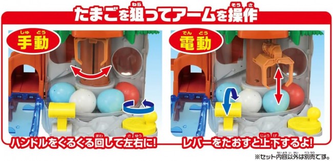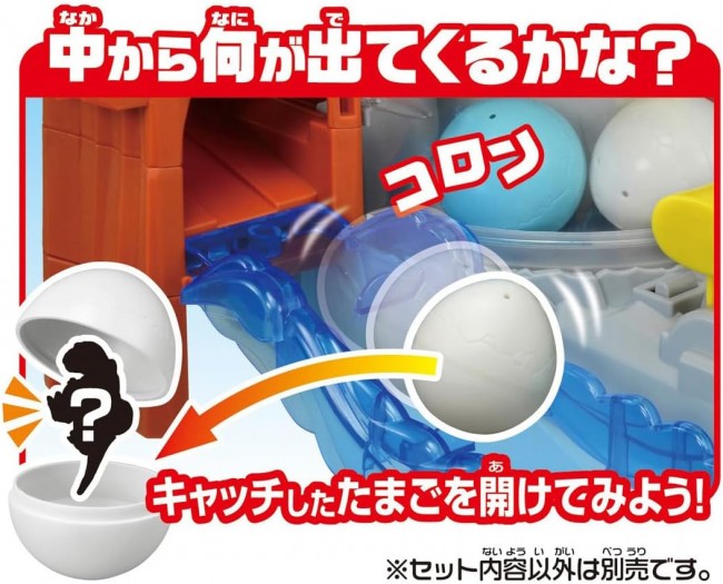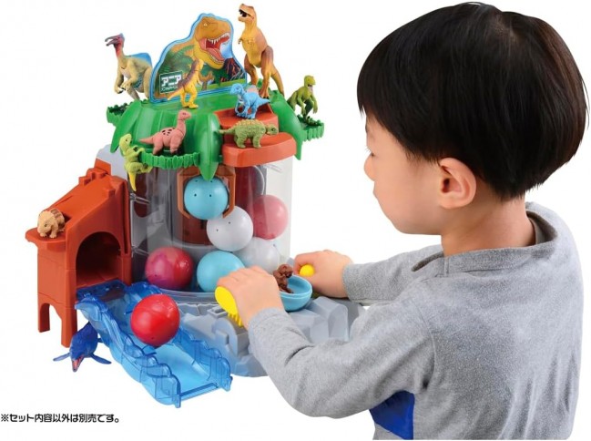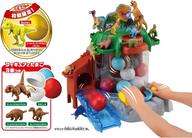 An Ania playset for crane game play! Catch and play with the egg containing the child dinosaur Ania! In addition, a gold Tyrannosaurus child figure and a gold egg are included as a limited first edition! *This is an initial limited edition, so the number is limited. The offer will end as soon as they are gone. This is a crane game where you catch the egg containing the dinosaur child ania. The crane is motorized to catch the egg, and a child ania dinosaur comes out from inside the egg. Around the play set, there are many places to play with the child dinosaurs and the optional Ania dinosaur figures. Comes with 3 eggs and Tyrannosaurus, Spinosaurus, and Ankylosaurus child figures, ready to play with as soon as you buy it. (*The Spinosaurus and Ankylosaurus have no movable parts.) In addition, the limited first edition comes with a gold Tyrannosaurus child figure and a gold egg! You can also play with the separately sold "Ania's Egg: Dinosaur Collection". In addition, the egg is fun to play with not only the figure but also sweets in it. Depending on the size and shape of the Ania, some items may not fit in the egg. *When playing with sweets in the egg, be sure to use individually wrapped sweets. Do not put candy and figures together. All other items are sold separately. Set Contents】Body(1),Board(1),Rocky place(1),Tunnel(1),Pillar(1),Slide(1),Egg(3),Tyrannosaurus (child)(1),Spinosaurus (child)(1),Ankylosaurus (child)(1),Seal(1),Gold tyrannosaurus (child)(1) ),Gold Egg(1) (C) TOMY Uses 3 AA alkaline batteries (batteries sold separately)