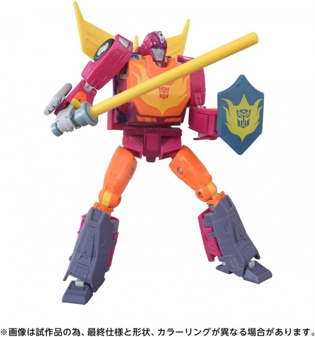 Action Figures (Anime/Sci-Fi Characters) Popular characters from the movie series are making their debut in the latest designs! This series is perfect for collectors who want to recreate the movie's world. Hot Rod, the warrior from ‘TRANSFORMERS THE MOVIE’, joins the MTMTE collection. This young Autobot warrior, who shares a bond of friendship with Daniel, Spike's son, transforms from a sports car into a robot. In addition to his standard Photon Laser, this figure includes a wealth of accessory parts to recreate scenes from the movie: the fishing rod he used in the film, training weapons, a Saw Blade that attaches to his arm, and a Matrix Part that can be stored in his chest. Contents Hot Rod MTMTE Collection main figure (1), Fishing rod (1), Photon Laser α (1), Photon Laser β (1), Saw blade (1), Sword (1), Shield (1), Matrix (1), Instruction manual (1) (C) TOMY