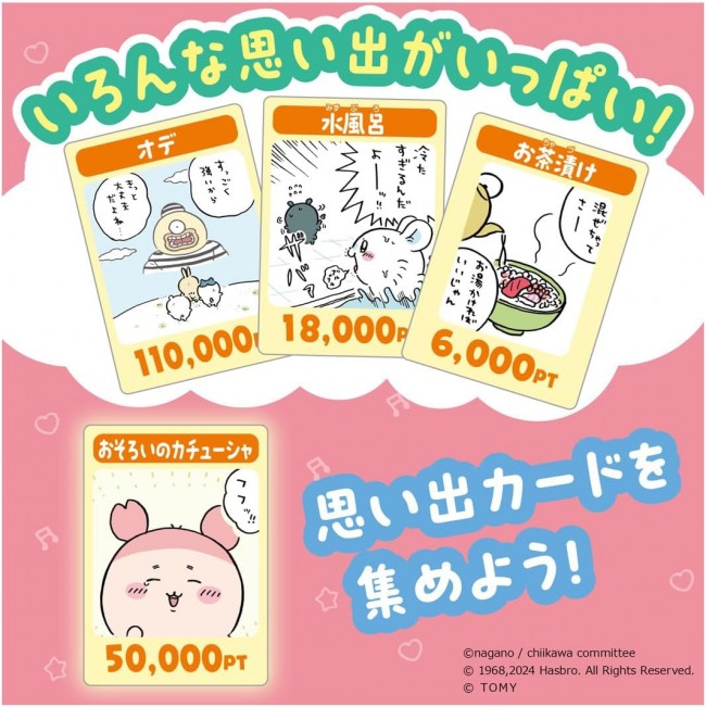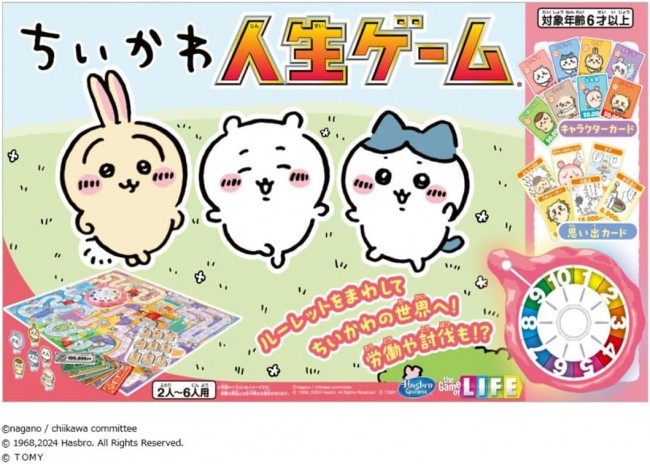 Chiikawa's “Game of Life” is now available! Turn the roulette and enter the world of Chiikawa! Work and defeat! There are 8 kinds of character cards to choose from! Full of various memories! 24 kinds of memory cards! Events such as “Big Defeat” and “Staring”! The person who collects the most PTs wins. Number of players: 2 to 6 Set Contents】Game board with roulette (1), character frame base (8), frame stand (6), character cards (8), memory cards (25), points (PT) 1 set (1), point stand tray (1), point stand sheet (3), instructions for play (1) (C) nagano / chiikawa committee (C) 1968,2024 Hasbro.