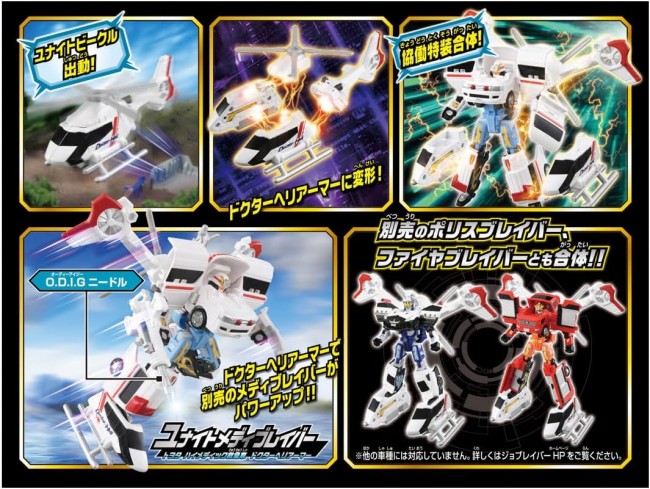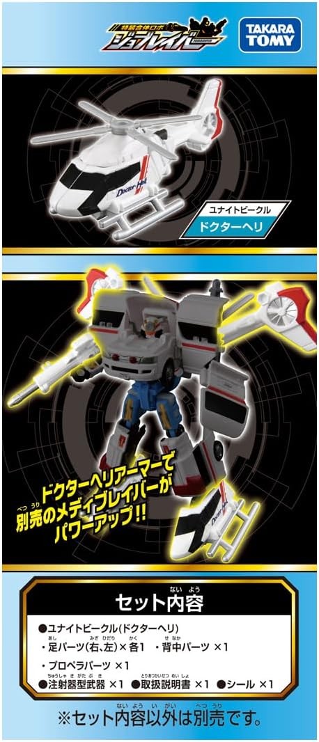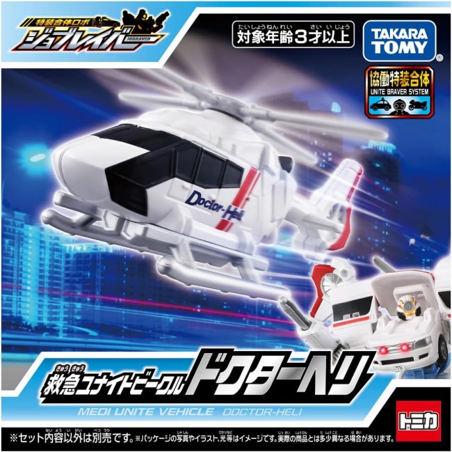 A new vehicle “First Aid Unite Vehicle Doctor Heli” that combines with MediBraver will appear from “Special Combination Robot Job Braver” starting July 6! The “First Aid Unite Vehicle Doctor Heli” combines with Medibraver to become the first aid robot “Unite Medibraver”! Combines with Job Reavers just like in the cartoon! Protect the city with the Job Reavers (sold separately)! This product can be combined with TJB01, TJB02, and TJB03, which will be released in June 2025. This product can be combined with TJB01, TJB02, and TJB03, which will be released in June 2025. Set includes: Unite Vehicle (Dr. Helicopter) leg parts (left) (1), Unite Vehicle (Dr. Helicopter) leg parts (right) (1), Unite Vehicle (Dr. Helicopter) back parts (1), Unite Vehicle (Dr. Helicopter) propeller parts (1), syringe-type weapon (1), stickers (1), instruction manual (1) instruction manual(1) (C) TOMY