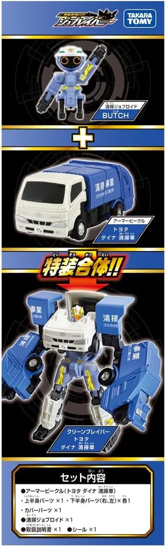 The new Jobraiver, ‘Clean Braver Toyota Dyna Sweeper Truck’, debuts from the Special Combination Robot Jobraiver series! The Armor Vehicle “Toyota Dyna Sweeper Truck” combines with the Sweeper Jobroid to become the sweeper robot “Clean Braver Toyota Dyna Sweeper Truck”! Job Braver combines with a satisfying click, just like in the anime! Protect the city together with other Job Braver units (sold separately)! 【Set Contents】Armor Vehicle (Toyota Dyna Sweeper Truck), Upper Body Parts (1), Armor Vehicle (Toyota Dina Sweeper) Lower Body Part (Right) (1), Armor Vehicle (Toyota Dina Sweeper) Lower Body Part (Left) (1), Armor Vehicle (Toyota Dina Sweeper) Cover Part (1), Sweeper Jobroid (1), Sticker (1), Instruction Manual (1) (C) TOMY