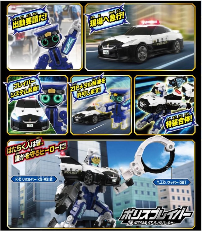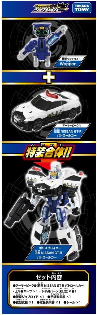 A new police jobber “Police Braver NISSAN GT-R Patrol Car” will appear from “Special Combination Robot Jobber” starting July 6! Armor Vehicle “NISSAN NISSAN GT-R Patrol Car” combines with a police jobber to become a police robot “Police Braver NISSAN NISSAN GT-R Patrol Car”! Jobber joins together like in a cartoon! Protect the city with the separately sold Job Reavers! The jobroid included in this product cannot be combined with the Job Raver armored vehicles released before July 2024. Weapon parts are included. Armor Vehicle (NISSAN GT-R Patrol Car) upper body parts (1), Armor Vehicle (NISSAN GT-R Patrol Car) lower body parts (right) (1), Armor Vehicle (NISSAN GT-R Patrol Car) lower body parts (left) (1), Armor Vehicle (NISSAN GT-R Patrol Car) upper body parts (1), Armor Vehicle (NISSAN GT-R Patrol Car) lower body parts (left) (1), Armor Vehicle (NISSAN GT-R Patrol Car) upper body parts (1) Police Jobroid(1),Handcuff Weapon(1),Gun Weapon(1),Seal(1),Instruction Manual(1) (C) TOMY