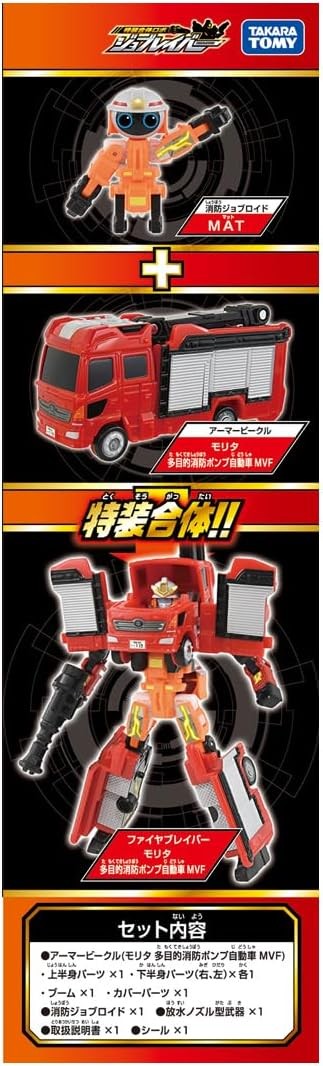 A new firefighting jobber “Fire Braver Morita Multipurpose Fire Pump Automobile MVF” will appear from “Special Combination Robot Jobber” starting July 6! Armor Vehicle “Morita Multipurpose Fire Pump Vehicle MVF” combines with Firefighting Job Laver to become Firefighting Robot “Fire Braver Morita Multipurpose Fire Pump Vehicle MVF”! Job Reavers combine with each other like in a cartoon! Protect the city with the Job Reavers (sold separately)! The Jobroid included in this product cannot be combined with ArmorTomica, a JobRaver product released before July 2024. The sticker specifications are different from those of JB02 released in July 2024. Weapon parts are included. Armor Vehicle (Morita Multipurpose Fire Pump Vehicle MVF) Upper Body Parts (1), Armor Vehicle (Morita Multipurpose Fire Pump Vehicle MVF) Lower Body Parts (Right) (1), Armor Vehicle (Morita Multipurpose Fire Pump Vehicle MVF) Lower Body Parts (Left) (1), Armor Vehicle (Morita Multipurpose Fire Pump Vehicle MVF) Upper Body Parts (Right) (1) Armor Vehicle (Morita Multipurpose Fire Pump Truck MVF)Boom(1),Armor Vehicle (Morita Multipurpose Fire Pump Truck MVF)Cover Parts(1),Fire Fighting Jobroid(1),Water Spray Nozzle Type Weapon(1),Seal(1),Instruction Manual(1) (C) TOMY