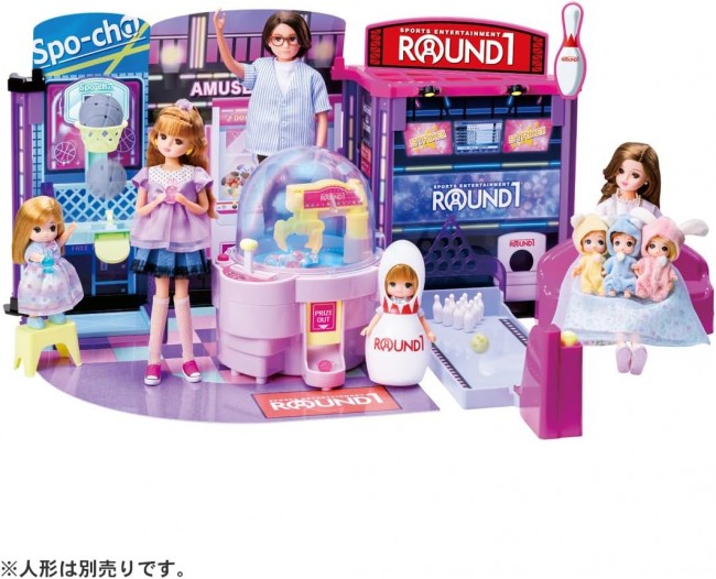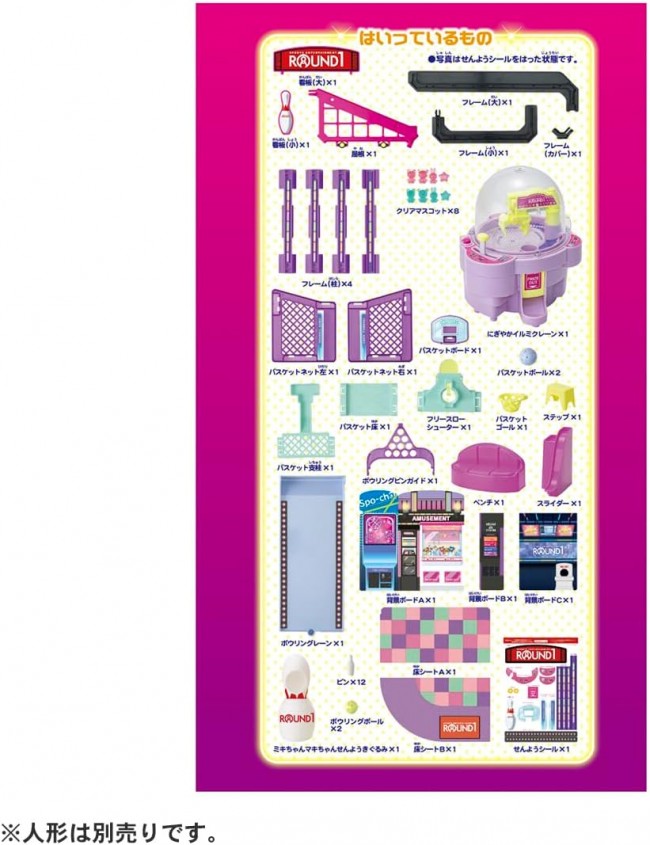 Let's all go to Round One! Let's play with Licca-chan and her family in colorful, chatty crane games, bowling games, and free-throw games★! Collaboration of indoor leisure complex “ROUND ONE” and Rica-chan! You can actually play the “Lively Illumination Crane” that lights up colorfully and plays music and Rika-chan's voice, the “Bowling Game” and the “Free Throw Game,” three games with lots of gimmicks! A ROUND 1 stuffed animal exclusively for Rika-chan's younger sister Miki and Maki and a bench for everyone to sit on are also included. Set includes: Nigiyaka Illumi Crane (1), Bench (1), Steps (1), Miki and Maki's Sengyo Kigurumi (1), Bowling Lane (1), Bowling Pin Guide (1), Bowling Balls (2), Slider (1), Pins (12), Basket Net Left (1), Basket Net Right (1), Basket Net Left (1), Basket Net Right (1), Basket Net Right (1), Basket Net Left (1), Basket Net Right (1), Basket Net Right (1), Basket Net Left (1), Basket Net Left (1), Basket Net Right (1), Basket Net Left (1), Basket Net Left (1), Basket Net Left (1), Basket Net Left (1), Basket Net Left (1), Basket Net Right (1) Basketball net right (1), Basketball board (1), Basketball prop (1), Basketball floor (1), Basketball goal (1), Basketball (2), Free throw shooter (1), Signboard (large, small) (1), Roof (1), Frame (large, small, cover) (1), Frame (column) (4) Background boards A, B, C (1),Floor sheets A, B (1),Senyo stickers (1),Clear mascot (8) (C) TOMY Uses 3 AA dry cell batteries (Batteries sold separately.) Please use alkaline batteries. *To prevent accidental ingestion, a “screw-on” battery case lid is used.
