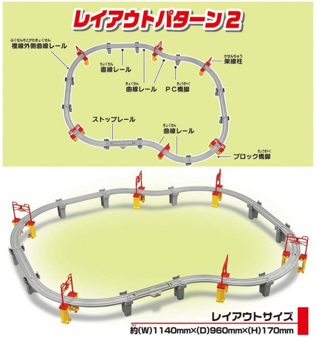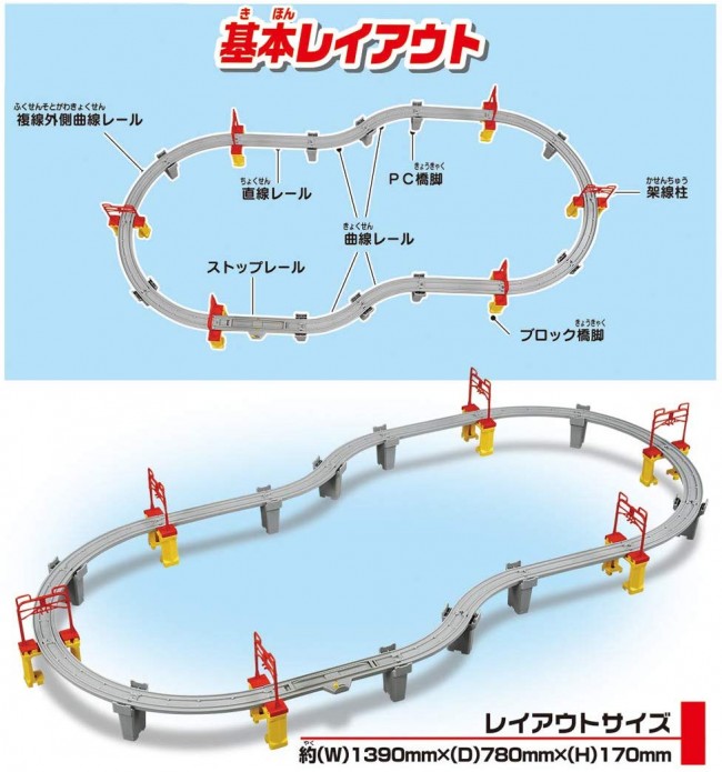 [Set contents] straight rail (3), stop rail (1), curved rail (4), double track outer curved rail (8), block pier (6), PC pier (10), overhead pole (12)