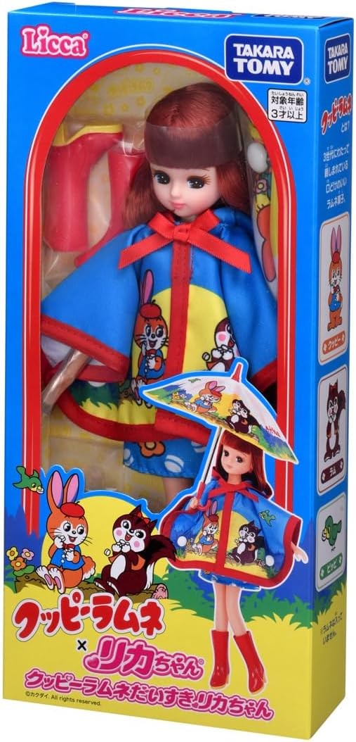 KUPPY RAMUNE and Rika-chan collaborate! Rika-chan is wearing a cute retro KUPPY RAMUNE umbrella and raincoat. Rika-chan's hair color is red, the same color as the KUPPY RAMUNE logo. The umbrella comes with joint parts for easy holding. The raincoat is removable, and she is wearing a light blue one-piece with a Kuppy Ramune pattern inside. Set includes] doll body (wearing underwear, earrings, dress) (1), umbrella (1), boots (1), joint parts (1) (C) TOMY (C) Kakudai