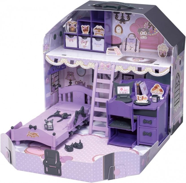 This is a bag-shaped room filled with Kuromi. Complete your own Kromi room with cute Kromi-colored furniture and Kromi-motif accessories! The loft comes with lovely furniture and accessories (computer, phone, catsuit, slippers, plates, cups) and paper goods. (1) Rika-chan can sit in the loft, and Miki and Maki can stand. The bed can also be placed on top of the loft, and the skylight can be opened and closed. (2)Tsukue can also be transformed into a dresser! School bags (sold separately) can also be placed under the chair. (3)Step shelf can be placed on the floor or in the loft in any direction. (4)Bag-shaped bedside table with lockable parts. (4) Bag-shaped bedside table with lockable parts, which can easily hold Rika-chan (sold separately) and a set of furniture, and can be easily transported. Set contents】Bag shaped bed (1), bed (1), bed railing (2), ladder (1), step shelf (1), chest, dresser (1), drawer (2), chair (1), hanger (2), hanger hook (2), runner parts (cushion for chair, flooring for chest, Bed decoration x 9)(1),Chromi accessories (computer, phone, slippers, catsuit, cup, plate)(1),Senyo sticker sheet(1),Paper accessories sheet (included in PKG mount)(1),*Doll, dress and some accessories are sold separately. (C) TOMY (C) 2025 SANRIO CO., LTD. TOKYO, JAPAN (L)