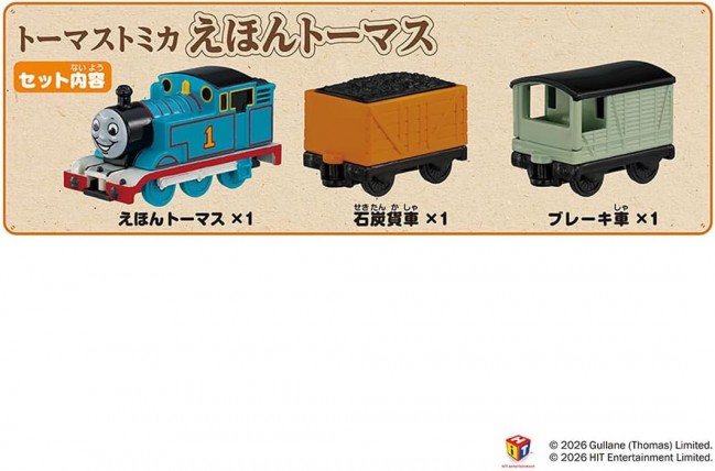 To commemorate the 80th anniversary of the original Thomas the Tank Engine book, a Thomas Tomica set inspired by the original picture book is here! This is a Thomas Tomica set inspired by the original picture book. Thomas's face, the body coloring, and the freight cars all feature special coloring based on the picture book. You can display it like the picture book cover or connect it with other Thomas Tomica sets (sold separately) to play. ■Set Contents ・Thomas (Picture Book Style) ・Brake Van ・Coal Wagon 【Set Contents】Thomas (1), Brake Van (1), Coal Wagon (1) (C) TOMY (C) 2026 Gullane (Thomas) Limited. (C) 2026 HIT Entertainment Limited.