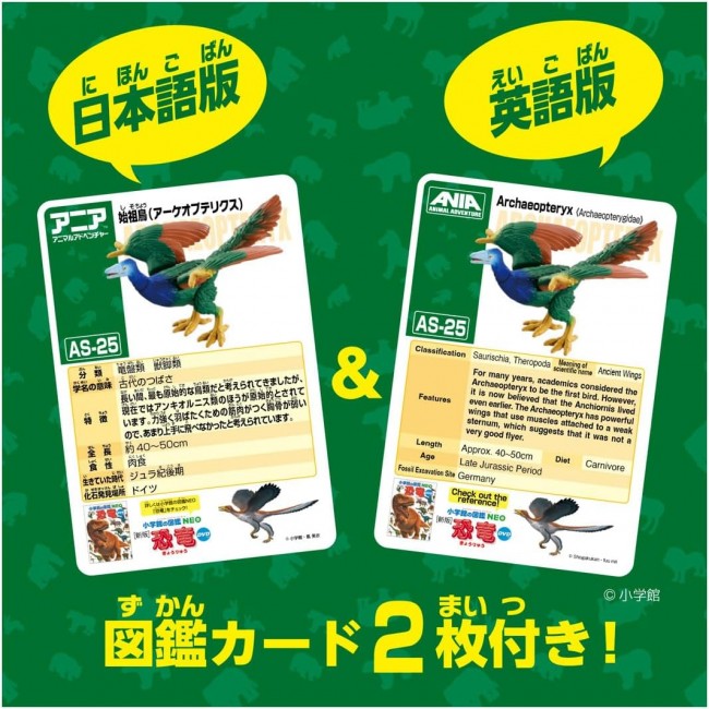 The “Archaeopteryx” is now available in the Ania AS series! When the tail feathers are moved up and down, the left and right wings flap up and down in tandem. The neck also moves. Ania” is a series of palm-sized animal figures that can be moved and played with. The “Ania” series is a series of palm-sized animal figures that can be played with by moving them around. The appeal of this series lies in its movable action, realistic modeling and painting, and palm-size for easy play. Set includes: Figure (1), illustrated book card (Japanese) (1), illustrated book card (English) (1) (C) TOMY