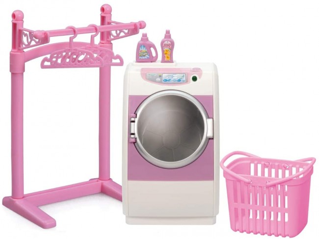 Includes a clothes rack, laundry basket, detergent and softener bottles, and two hangers