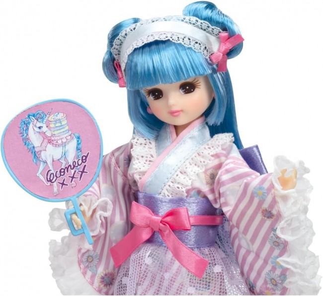 The second collaboration between illustrator ECONECO and Rika-chan is a yukata style with pop patterns and lace! This cute yukata is full of popular dreamy animal patterns, lace, and ribbons. The hair style is a light blue bun with a very cute lace headdress. A unicorn-patterned blue fan is included. Set includes: Doll (wearing underwear, earrings, yukata) (1), fan (1), shoes (zori, no bitterness) (1), catsuit (1) (C) TOMY (C) ECONECO