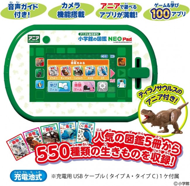Shogakukan's NEO Encyclopedia Pad! Featuring 550 Creatures from 5 Popular Volumes! Includes Tyrannosaurus Ania! 〇 Encyclopedia: Features 550 creatures from 5 popular volumes of Shogakukan's NEO Encyclopedia: “Animals,” “Dinosaurs,” “Insects,” “Fish,” and “Birds”! Features text-to-speech & camera functions! Take photos and register them to the encyclopedia pages. Create your very own encyclopedia! 〇Games: 100 apps for learning through play! Includes apps to play with the Ania figure and apps to train non-cognitive skills. 〇Camera: Take photos of real Anias and use them in games. Includes one Tyrannosaurus Ania! Compatible with Takara Tomy AC Adapter TYPE5C2 (sold separately). 【Set Contents】Main Unit (1), Charging USB Cable (Type A & Type C) (1), Instruction Manual (1), Ania (Tyrannosaurus) (1) (C) Shogakukan (C) TOMY Uses 1 lithium-ion battery (battery is built-in). ※Please use the Takara Tomy toy-specific AC adapter.