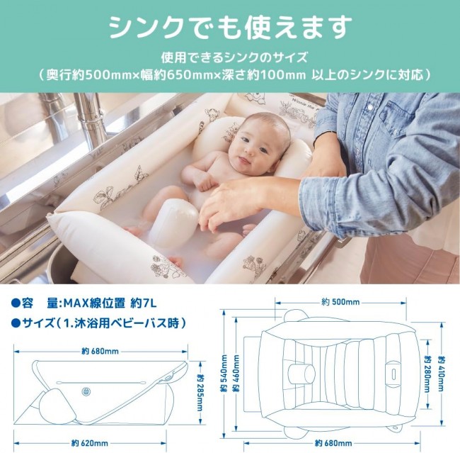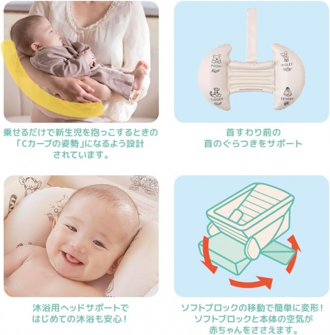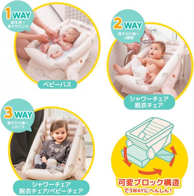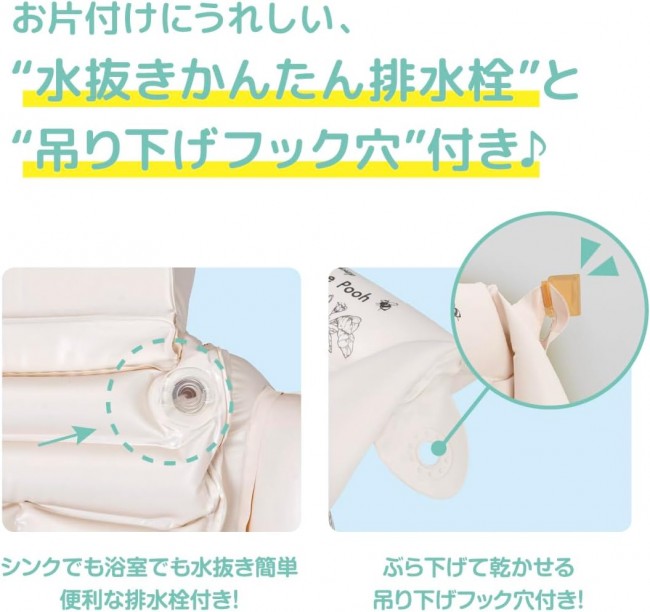 From newborn bathing to around 2 years old. The baby bath transforms into a baby chair! Winnie the Pooh's baby bath can be easily transformed into 3 different shapes for long-term use! [Age range] 0 months to around 2 years old [Easily transforms into 3 different shapes with a variable block structure] ? 1-way (baby bath for bathing): 0 months to when the baby can hold their head up For bathing newborns. Can be used in the sink or bathtub. ? 2-way (shower chair, changing room chair): After the baby can hold their head up to around 2 years old Supports sitting before the baby can sit upright, and can also be used as a chair to keep the baby waiting in the shower or changing room. ? 3-way (shower chair, changing room chair, baby chair): From when the baby can sit up on their own until around 2 years old Once the baby can sit up on their own, it can also be used as a baby chair. 【Product Features】 ? Comes with a dedicated air pump ? Can be used in the sink. ? Soft blocks and side air chambers provide support to prevent the main body from wobbling. ? Includes a bathing head support: Makes the first bath safe and secure! ? Drain plug: Easy to drain water in the bathroom or sink. ? Designed to naturally form the “C-curve posture” when holding a newborn. ? Features a hanging hook hole for drying. ? Convenient drain plug makes draining water easy.
