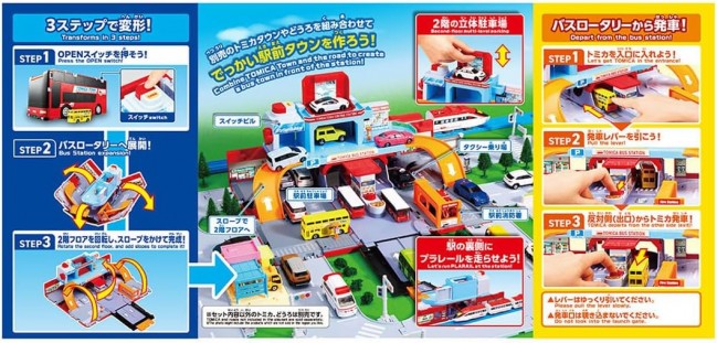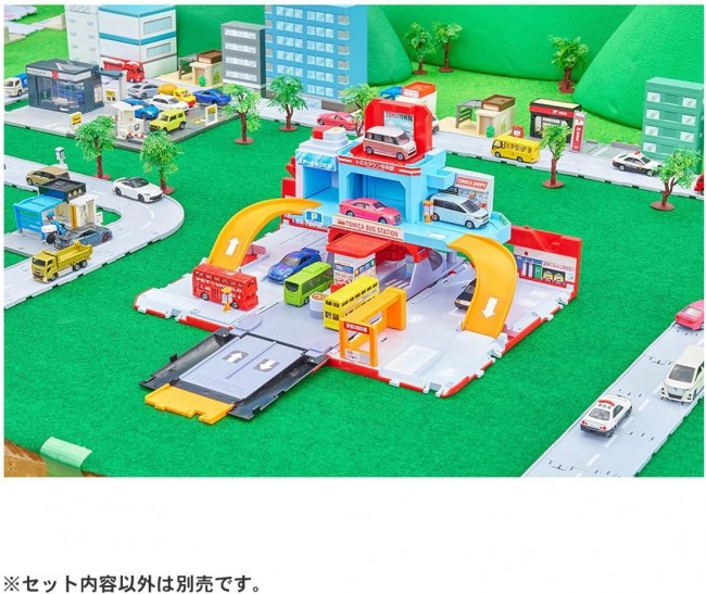Collection Toy (Passenger Car / Ready-to-Play) Vehicle Town Series New Release! An all-in-one set featuring a die-cast Tomica that lets you enjoy both hand-rolling play with the big vehicle and transforming town play! This single product lets you start playing right away! Expand your play! A great value set! 1: Big Vehicle Hand-Rolling Play Cool proportions, like a Tomica made larger! Unprecedented realistic details! You'll want to roll it by hand and line it up with your Tomica! Holds over 10 Tomica cars in vehicle mode! Perfect for taking your favorite Tomica on outings! 2: Transformable Town Play - Educational Elements! Easily transform it into Tomica Town with your own hands! Cool vehicles quickly turn into cool buildings! Buildings and parking lots appear as Tomica Town! Makes you want to play with Tomica! Packed with fun Tomica play: hand-rolling, departure play, rooftop elevators, and more! Plus, it connects to Tomica roads! Play together with other Tomica World and Tomica Town products! 3: Includes die-cast Tomica vehicles! Play with 2 vehicles! This one product lets you start playing right away! Expands play possibilities! Great value set! Perfect for first big vehicles! Even Tomica beginners can enjoy playing. Transforms into a town for complex play, growing with your child for long-lasting fun! Contents Main Unit (1), 2nd Floor Panel (1), Central Building (1), Car Elevator (1), Switch Building (1), Back Panel (L) (1), Back Panel (R) (1), 2nd Floor Panel (1), Ramp (L) (1), Ramp (R) (1), Sidewalk (1), Mini Road (1), Fire Station Panel (1), Fire Station Wall (1), Bus Stop Signs (2), Special Tomica (1), Sticker (1), Instruction Manual (1) (C) TOMY (From the Takara Tomy website)