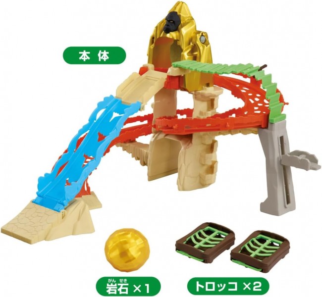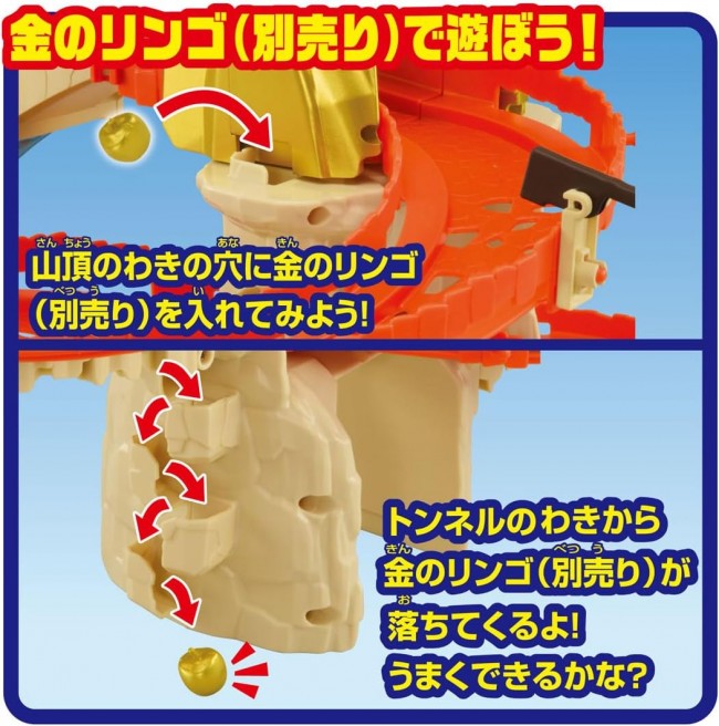 King Gold Mountain from the Ania anime “Adventure Continent: Ania Kingdom”! Golden rocks tumble everywhere! Trolleys race along! Take the elevator up the mountain! Lots of thrilling fun to be had! King Gold Mountain is packed with fun activities and gimmicks! (1) Thrilling! Dash down from the summit in a trolley! (2) Play with two types of tracks: S-curve and waterfall! The S-curve track can also run “Tomica” cars! (3) Heart-pounding! Aim for the summit with the elevator! (4) Golden rocks tumble everywhere! (5) Cross the swaying bridge! *Ania (figures) and Tomica (mini cars) sold separately. 【Set Contents】Mountain Base (1), Rail 1 (2), Rail 2 (1), Rail 3 (1), Waterfall Part (1), Summit (1), Elevator Base (1), Elevator Platform (1), Base Part (1), Summit Rail (1), Rock (1), Crossing Part (1), Wobbly Bridge (1), Trolley (2) (C) TOMY