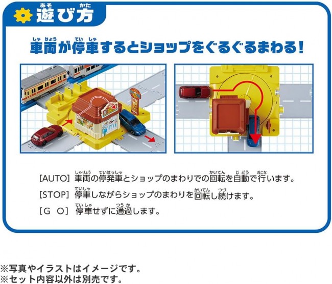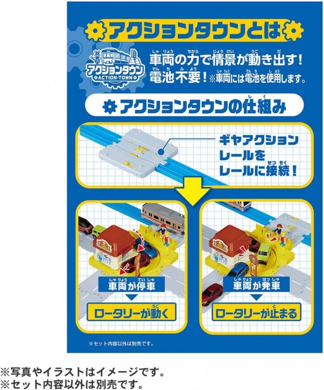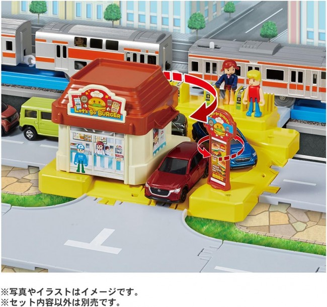 No batteries needed! The vehicles power the action! Introducing Action Town's Drive-Thru! When a vehicle arrives, the Tomica cars in the rotary automatically circle around the shops! The signs spin too! The included Gear Action Rails are 1/2 straight rail size for easy layout building! Create your own moving town! The Gear Action Rail can be switched between three modes: AUTO, STOP, and GO. In AUTO mode, vehicles stop upon arrival, the rotary turns, and Tomica cars rotate around the shop. After a set time, vehicles depart and the rotation stops. In STOP mode, vehicles remain stationary while continuously rotating around the shop. (In GO mode, they depart and stop.) In GO mode, vehicles pass through without stopping. ■ You can place Tomica cars on the rotary to play. ■ By changing the positions of the shop and the standing signboard, you can alter the drive-through entrance/exit and the direction of the Tomica cars to play. ■ The rotary can be connected to Tomica Town roads for play. ※ Plarail vehicles require batteries. ※ Tomica (miniature cars) are sold separately. ※ Tomica Town roads are sold separately. 【Set Contents】Shop body (1), Roof (1), Roof sign (1), Standing sign (1), Roundabout (1), Gear Action Rail (1), Sticker (1), Parts order form (1) (C) TOMY