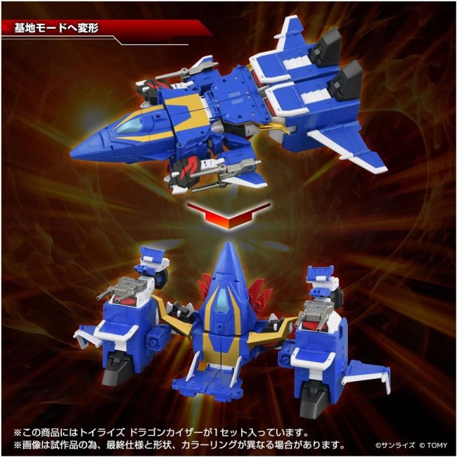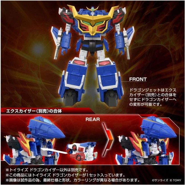 Action Figures (Anime/Science Fiction Characters) <Giant Transformable Dragon Kaiser is ready to go! Giant Transformable Dragon Kaiser Product Point Dragon Kaiser The giant jet transforms into a 25cm tall Dragon Kaiser, with a full-body posability gimmick that allows for a variety of poses! The face mask can be removed to recreate the face in its unmasked state. The dragon cannon and wings equipped on both arms share the same 5mm joints. The Dragon Cannon and wings on both arms are jointed with common 5mm joints, and can be replaced with a single Dragon Kaiser or jointed to the King Ex Kaiser (sold separately). The dragon archery on the chest is reproduced as a new weapon, split into two parts, and can be used as a hand-held dagger. It also functions as a joint to the Kaiser Sword. The dragon anchors on both shoulders are also removable and can be used as weapons. Dragon Jet Can be used in conjunction with EX KAIZER (sold separately), jointed to the top of the Dragon Jet, or combined into a giant Dragon Kaiser. The Dragon Jet can also be attached to the Toy Rise King Exhauser (sold separately) to recreate the image from the movie! Base Mode Can be transformed into ToyRise's original base mode, which can also be combined with ToyRise King Exhauser (sold separately) for a variety of play modes. The base mode uses a common 5mm joint, allowing you to freely change the placement of weapons and other parts. Great Base Mode Can be combined with the base mode of the ToyRise King EXHAUSTIZER (sold separately) to create even more different weapon layouts and layouts. The base mode uses common 5mm joints, allowing you to freely change the placement of weapons and other parts. Super Giant Combined Great EXKAIZER By combining with the Toy Rise King EXKAIZER (sold separately), you can recreate a 35cm-long ! The Super Gigantic Combination uses the same combining system as King Ex-XCeasers, allowing for full body movement even after combining with an Ex-XCeasers figure. The face parts are selectable between mask-on and mask-off. The giant Kaiser Sword included with Dragon Kaiser can be attached. What is TOYRISE? TOYRISE is a product that incorporates TOMY's wealth of experience and knowledge. Its features go beyond mere new gimmicks to provide creative play that stimulates the user's imagination. Each individual item demonstrates its own unique charm with a sense of free scale. In addition, the common standard joints allow for customization. Contents Dragon Kaiser (1), chest parts (1), arm parts (right) (1), arm parts (left) (1), weapons (2), sword (1), head parts (1), face parts A (1), face parts B (1), instruction manual (1) (C) TOMY (C) SUNRISE