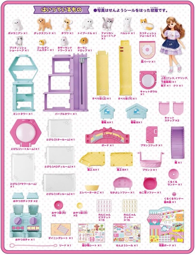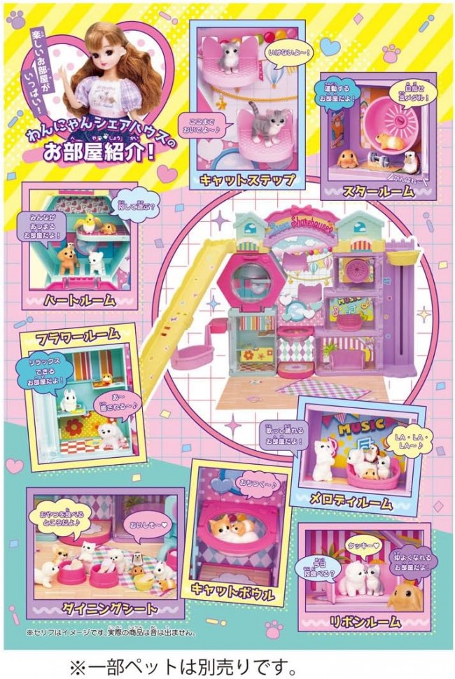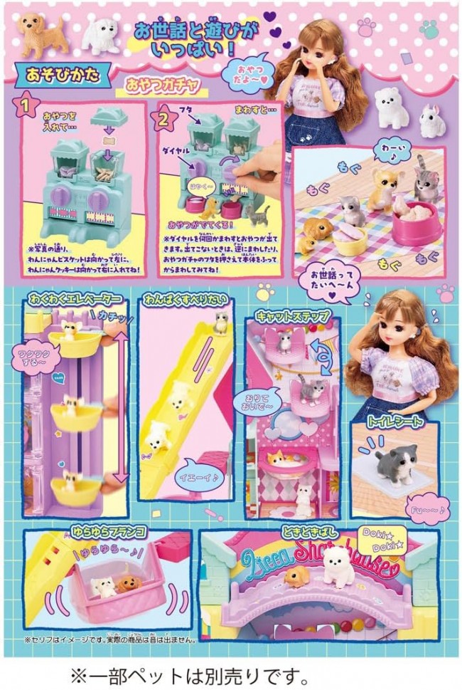 The Dog & Cat Share House and Pet Sitter Licca-chan arrive as a set! Welcome to the share house where Licca-chan and various pets live happily together♪ This set includes Licca-chan dressed in her pet sitter outfit. The Dog & Cat Share House features five rooms designed for fun care play. It's packed with gimmicks like everyone's favorite treat gacha machine, a swing, an elevator, and a slide! Plus, it includes a whopping 11 popular pets! Accessories are also plentiful. 【Set Contents】Wan-Nyan Share House (1), Pets (11), Snack Gacha (1), Large Snack Bowl (5), Small Snack Bowl (5), Wan-Nyan Biscuits (15), Wan-Nyan Cookies (15), Cat Ear Sofa (1), Best Friend Sofa (1), Leash (1), Dining Mat (1), Background Board (1), Special Stickers (1), Paper Accessory Sheet (1), Doll (Wearing Dress, Earrings, Underwear) (1), Socks (1), Shoes (1) (C) TOMY
